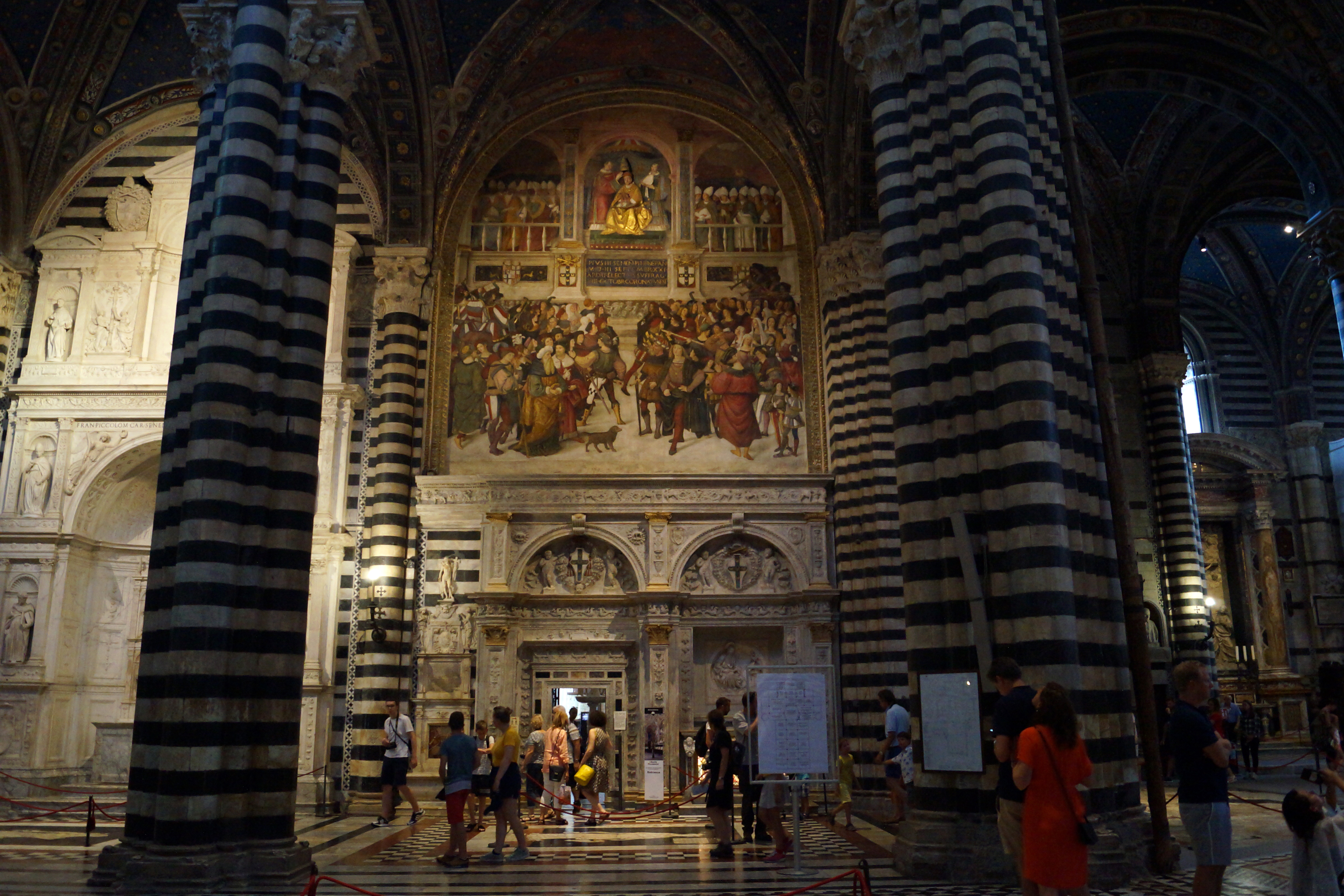 Одна из главных достопримечательностей собора – библиотека Пикколомини (Libreria Piccolomini). Ее основал в 1492 г. архиепископ Сиены кардинал Франческо Пикколомини Тодескини (в последствии Папа Пий III) для хранения богатейшего книжного собрания Папы Пия II (Пикколомини), умершего в 1464 г. Левая арка над бронзовой дверью работы Антониоло ди Джакомо ведет в Библиотеку, никогда не увидевшую книг Пия II, но зато расписанную превосходнейшими фресками по сводам (1502–03) и по стенам (1505–07) Пинтуриккио, начавшим эти вещи уже после смерти Пия III.