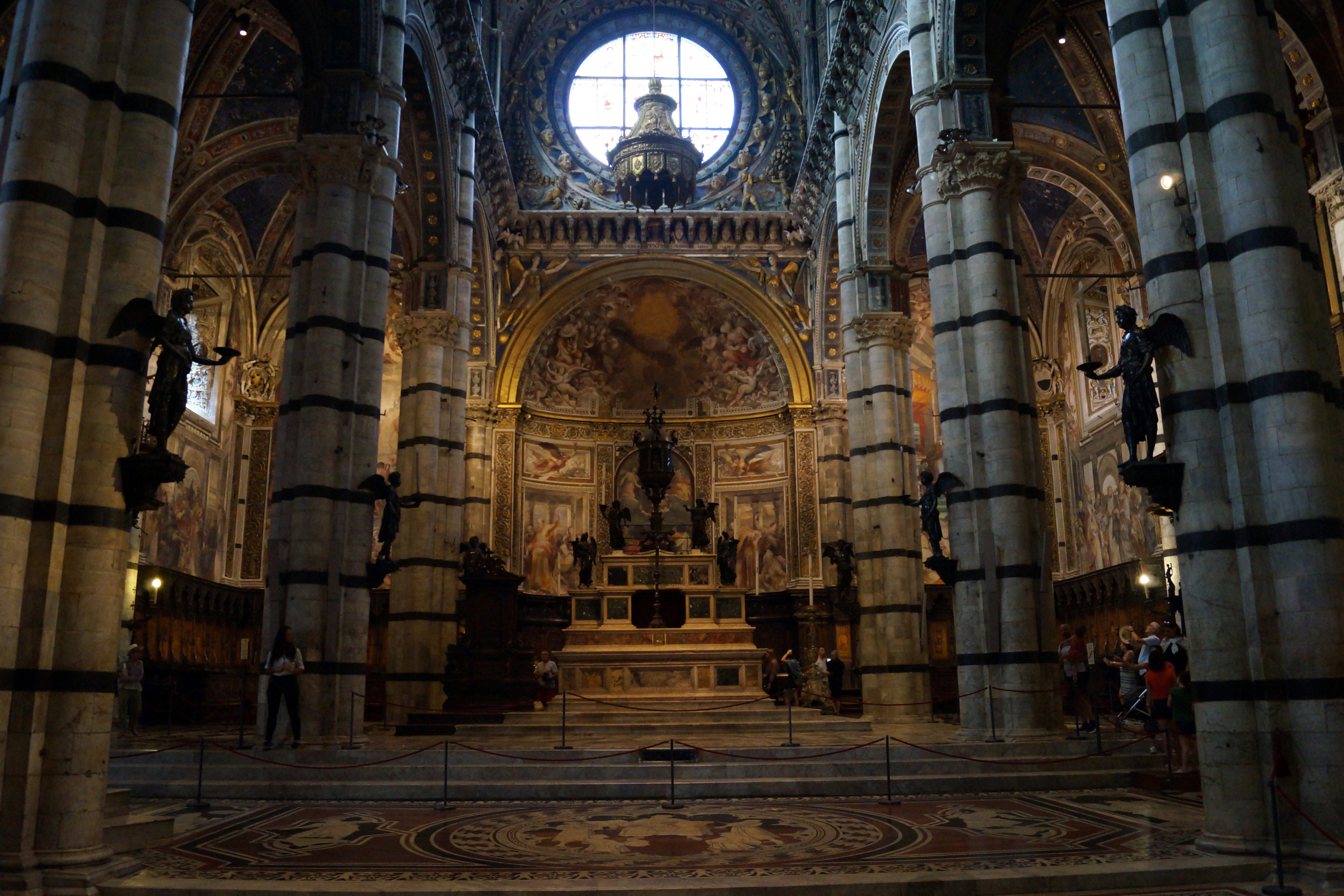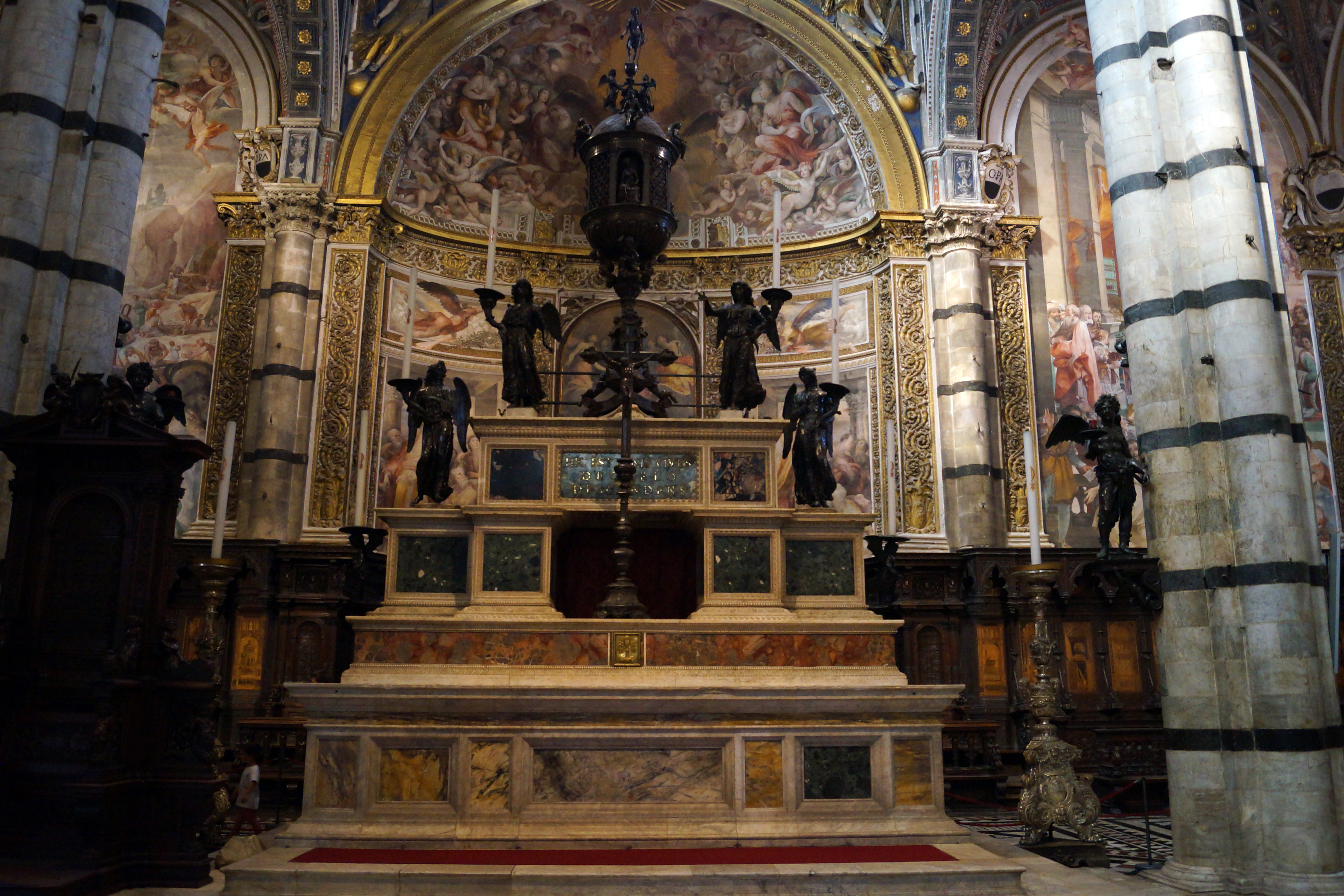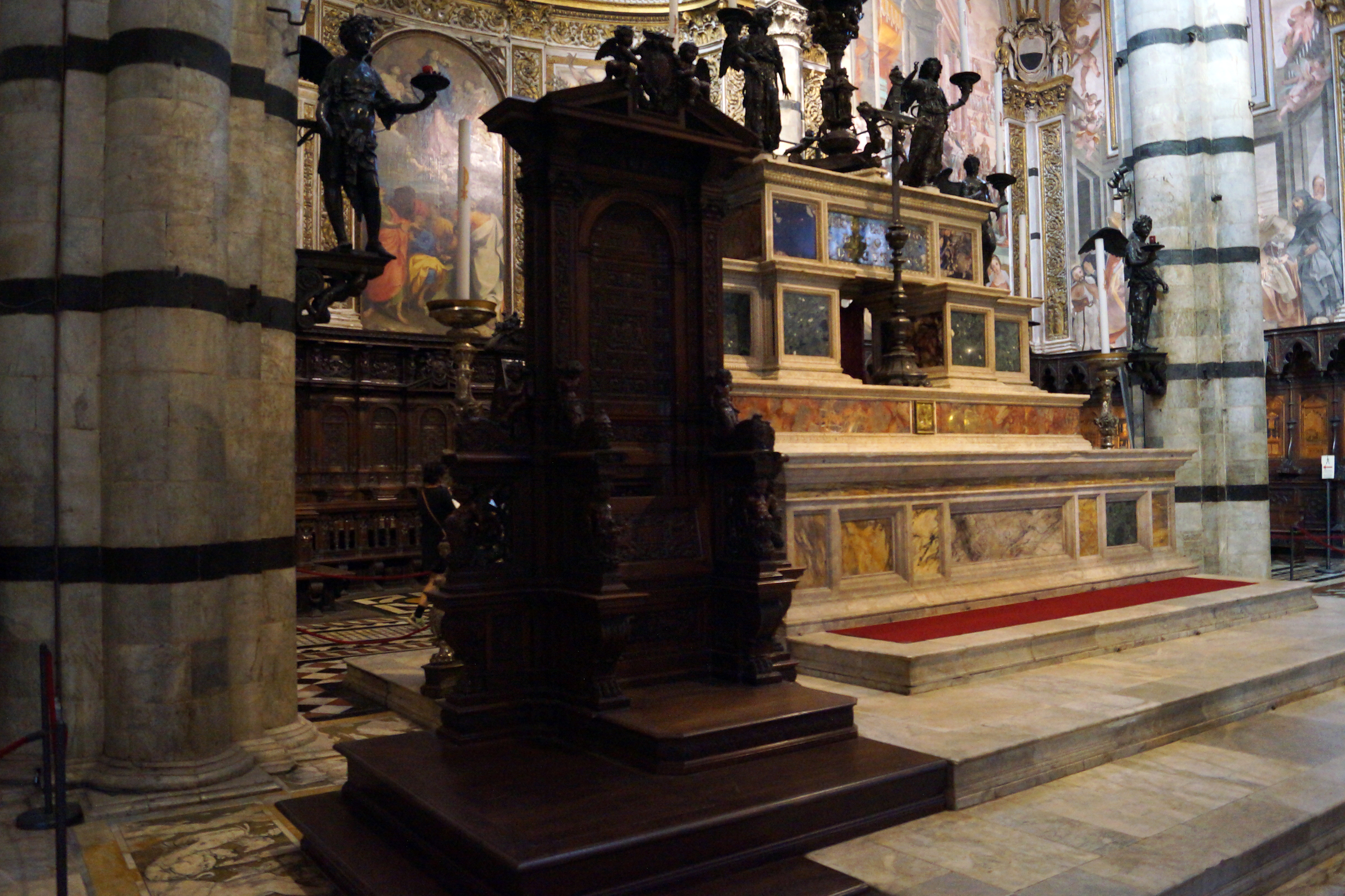 Основным элементом Клироса, конечно же, является Главный Алтарь, возведённый Балдассаре Перуцци в 1532 году. Скульптор поместил в центр композиции большую бронзовую дароносицу работыы Веккьетты (1467-1472), перенесённую сюда в 1506 году из церкви Благовещения при больнице Санта Мария делла Скала, с двумя парами ангелов-держателей для канделябров, самый нижний из которых – изысканное творение Франческо ди Джорджо Мартини; Беккафуми принадлежит восемь ангелов на кронштейнах пилястров.