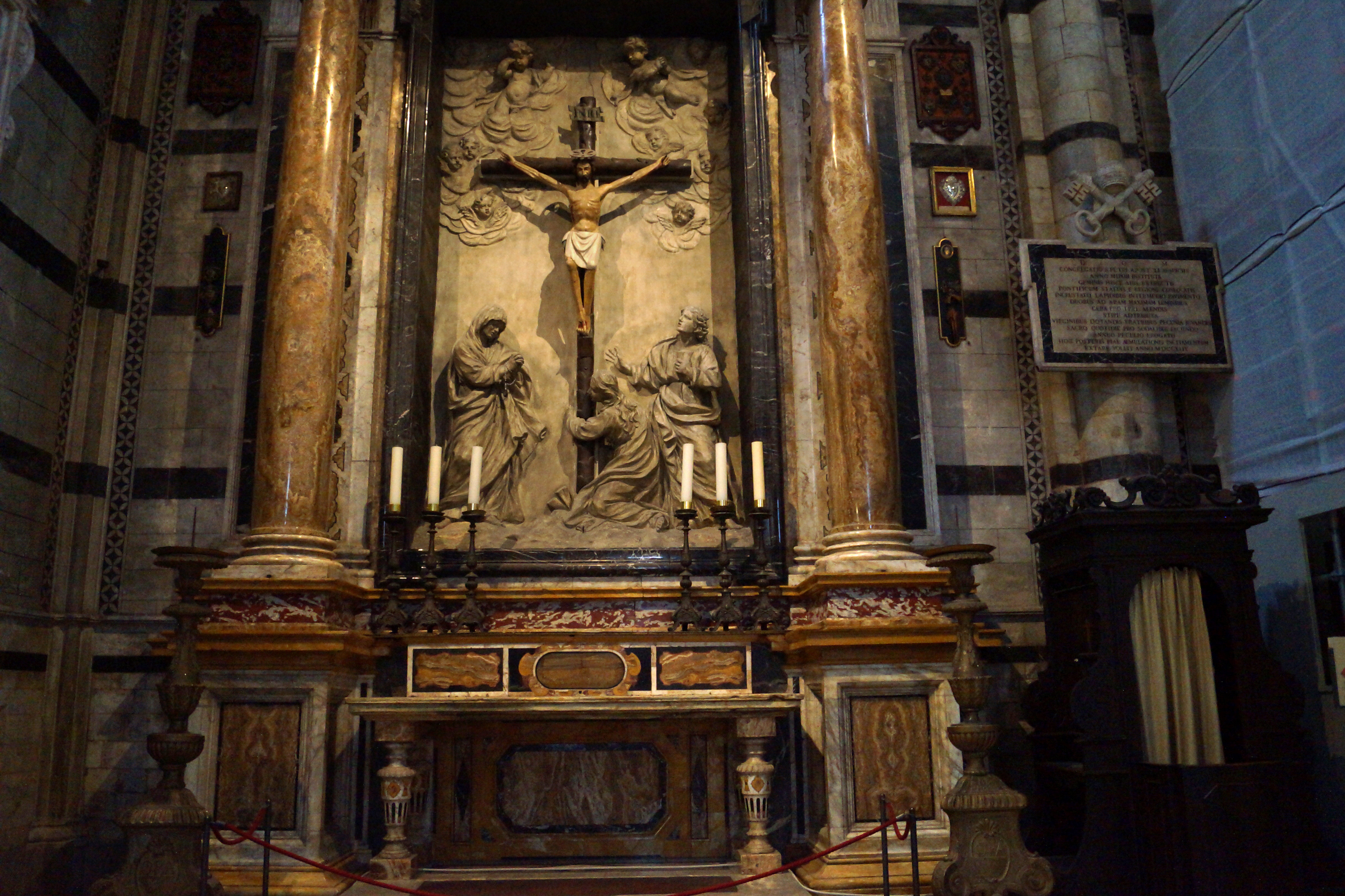 Украшением алтаря Конгрегации святого Петра служит Распятие из полихромного дерева, которое долгое время ошибочно считалось тем, которое несли сиенцы накануне битвы при Монтаперти и в Карроччо в день и которому они всегда приписывали причину победы над флорентийцами. На самом деле, Распятие не является произведением неизвестного художника середины четырнадцатого века, характеризующегося жесткими формами и чрезмерной фронтальностью. Рельеф в белой штукатурке, который сопровождает Распятие, восходит к началу восемнадцатого века и не без сомнений можно отнести к мастерской Джузеппе Маццуоли или его преемников; изображает Богородицу, Иоанна Богослова, Марию Магдалину, стоящую на коленях, и облако ангелов и херувимов.