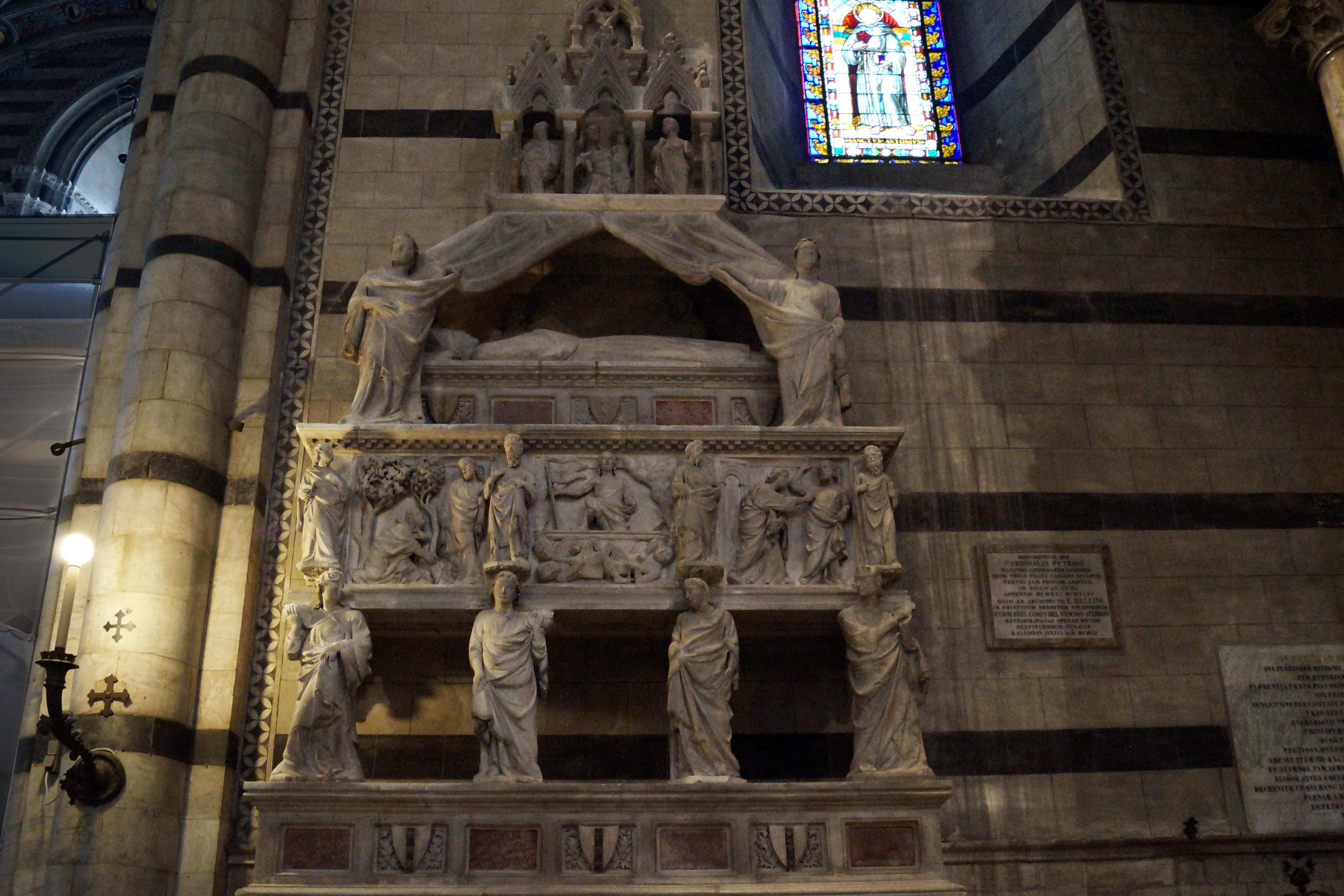 С 1317 по 1318 год сиенским скульптором Тино ди Камайно был установлен похоронный памятник кардиналу Риккардо Петрони (Сиена 1250 - Генуя 1314, юрисконсульт папы Бонифация VIII). Он сменил своего отца в качестве главного строителя Сиенского собора. Мраморный памятник в левом трансепте - самый ранний образец погребальной архитектуры XIV века. Он состоит из богато украшенного саркофага, поднятого на плечи четырех статуй. Над саркофагом два ангела раздвигают занавес, обнажая кардинала, лежащего на смертном одре, в сопровождении двух ангелов-хранителей. Памятник венчает шпилированная скиния со статуями Мадонны с Младенцем, Святым Петром и Павлом.
