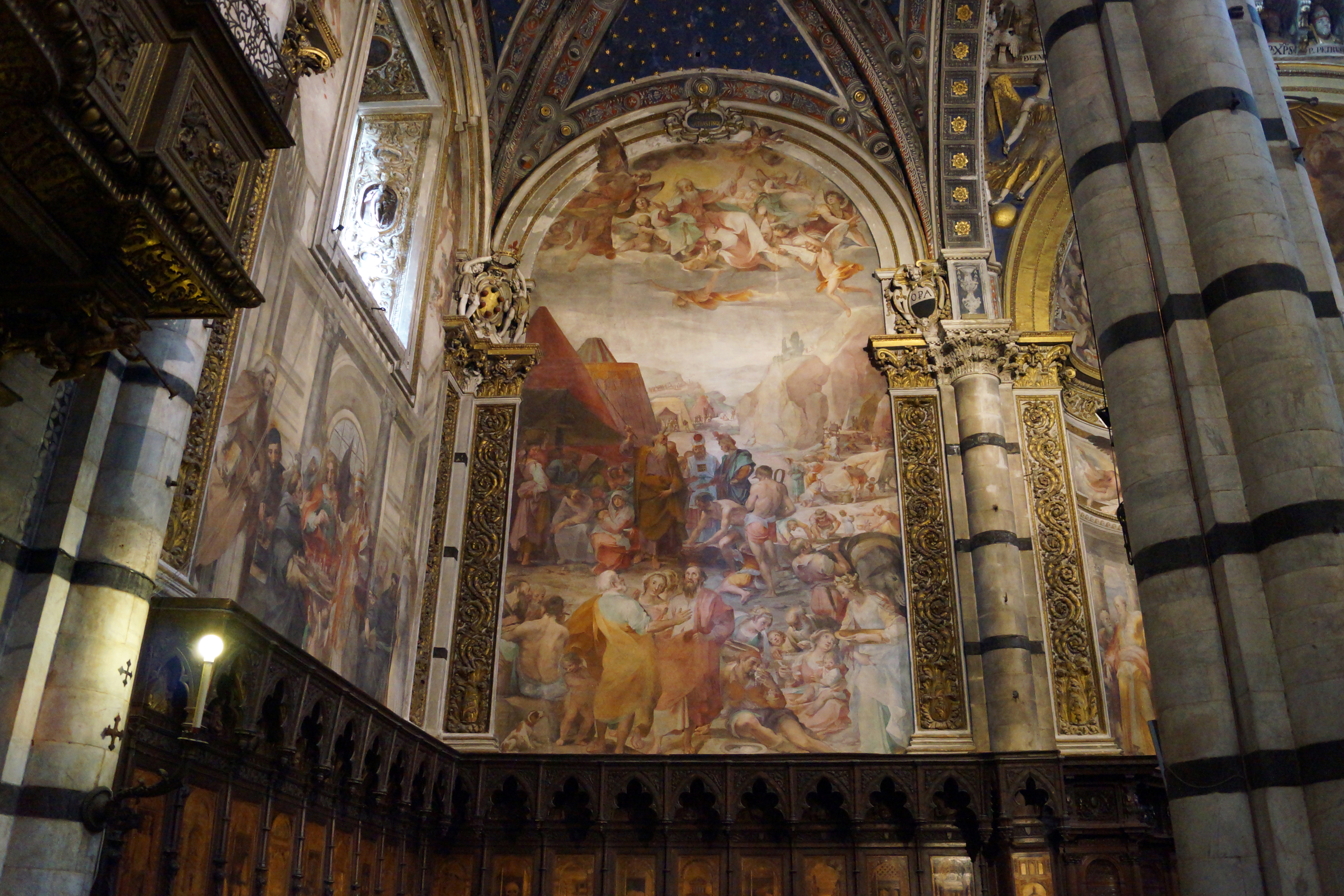 Фрески Вентуры Салимбени "Падение манны небесной" и "Амброз Сиенский и другие сиенские блаженные преподносят Сиену папе Григорию" (слева).