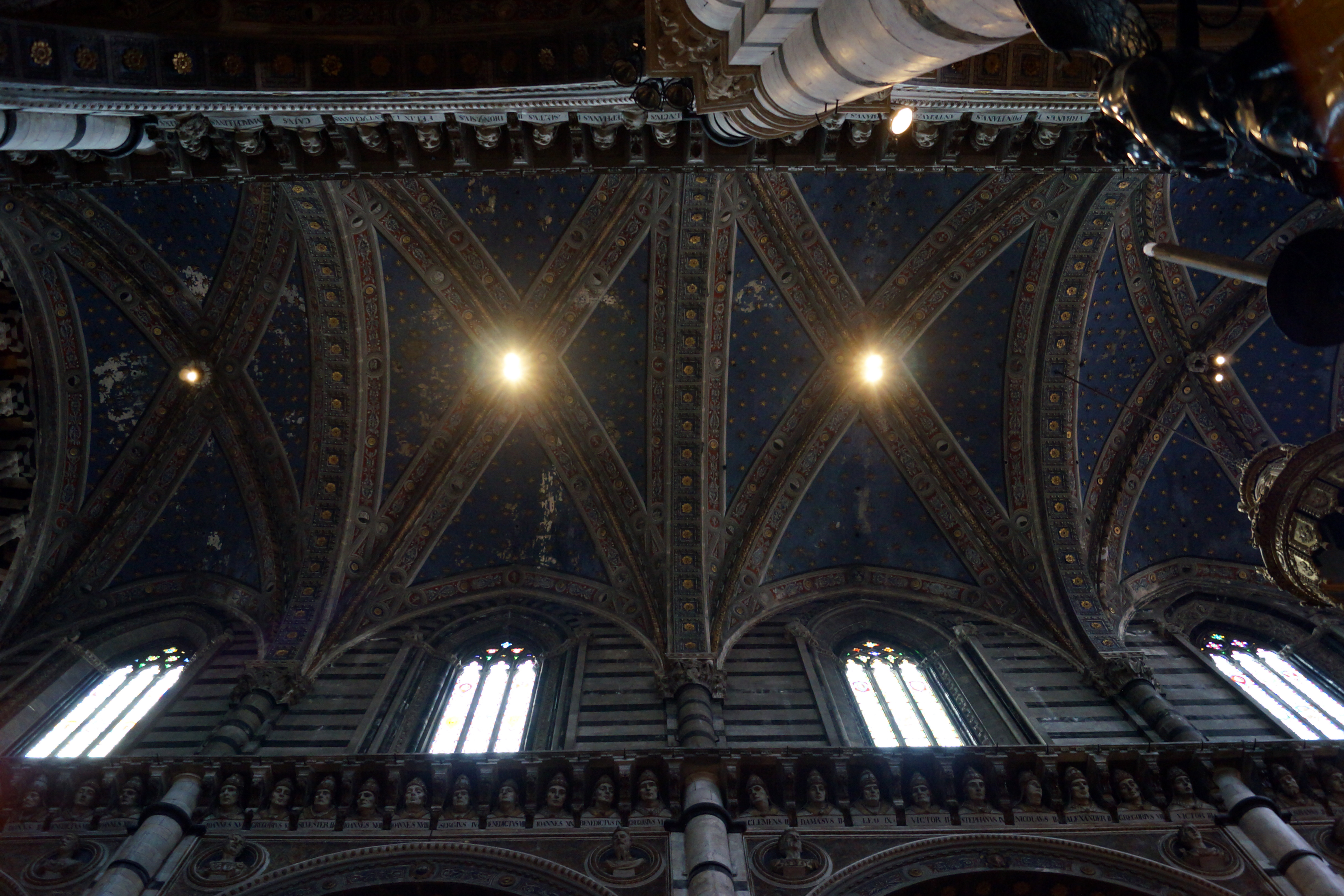 Горизонтальное лепное украшение вокруг нефа и пресвитерии содержит 172 гипсовых бюста пап XV и XVI веков, начиная со Св. Петра и заканчивая Люциусом III. В пазухах круглых арок под этим карнизом изображены бюсты 36 императоров. Сводчатый купол украшен синим цветом с золотыми звездами.