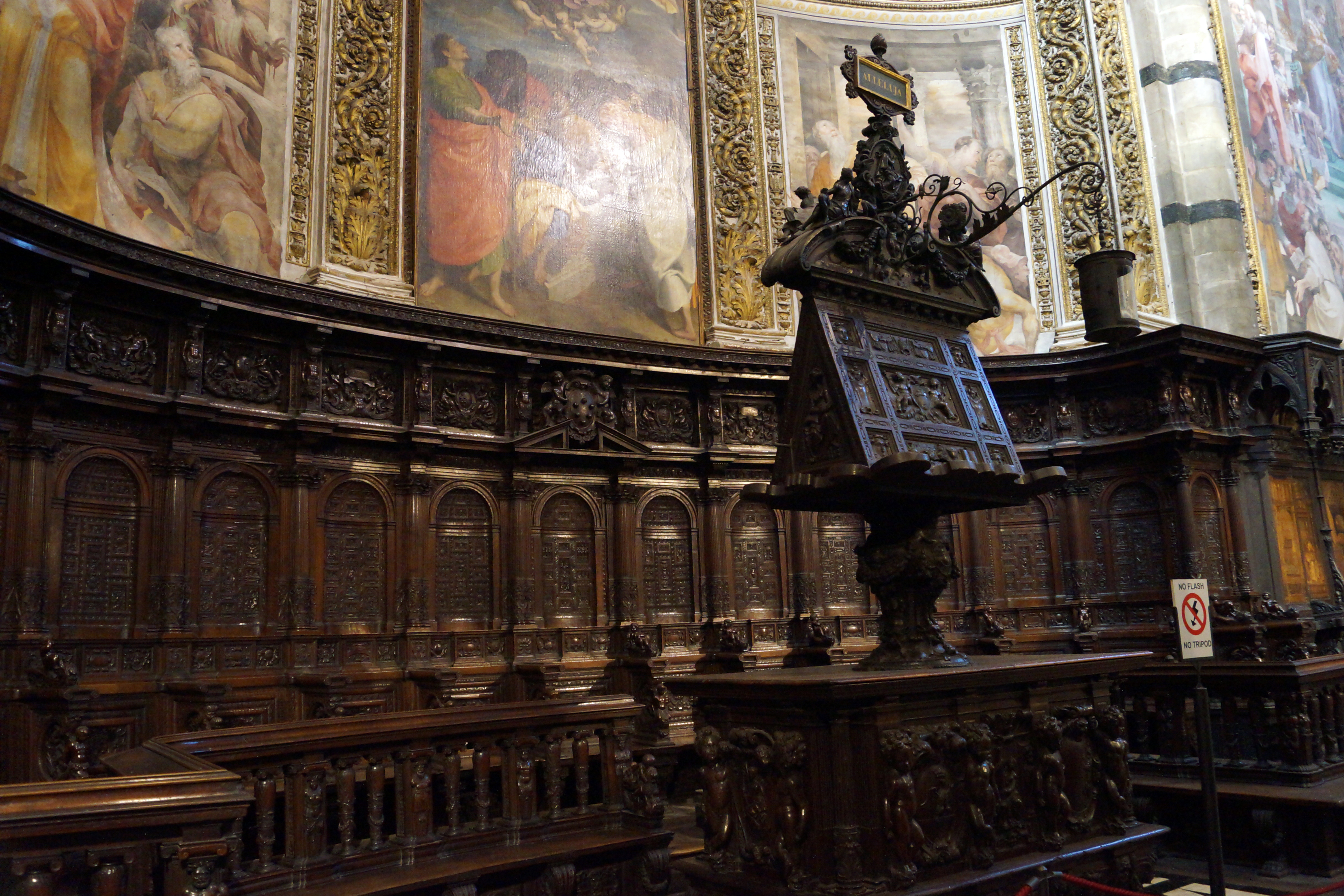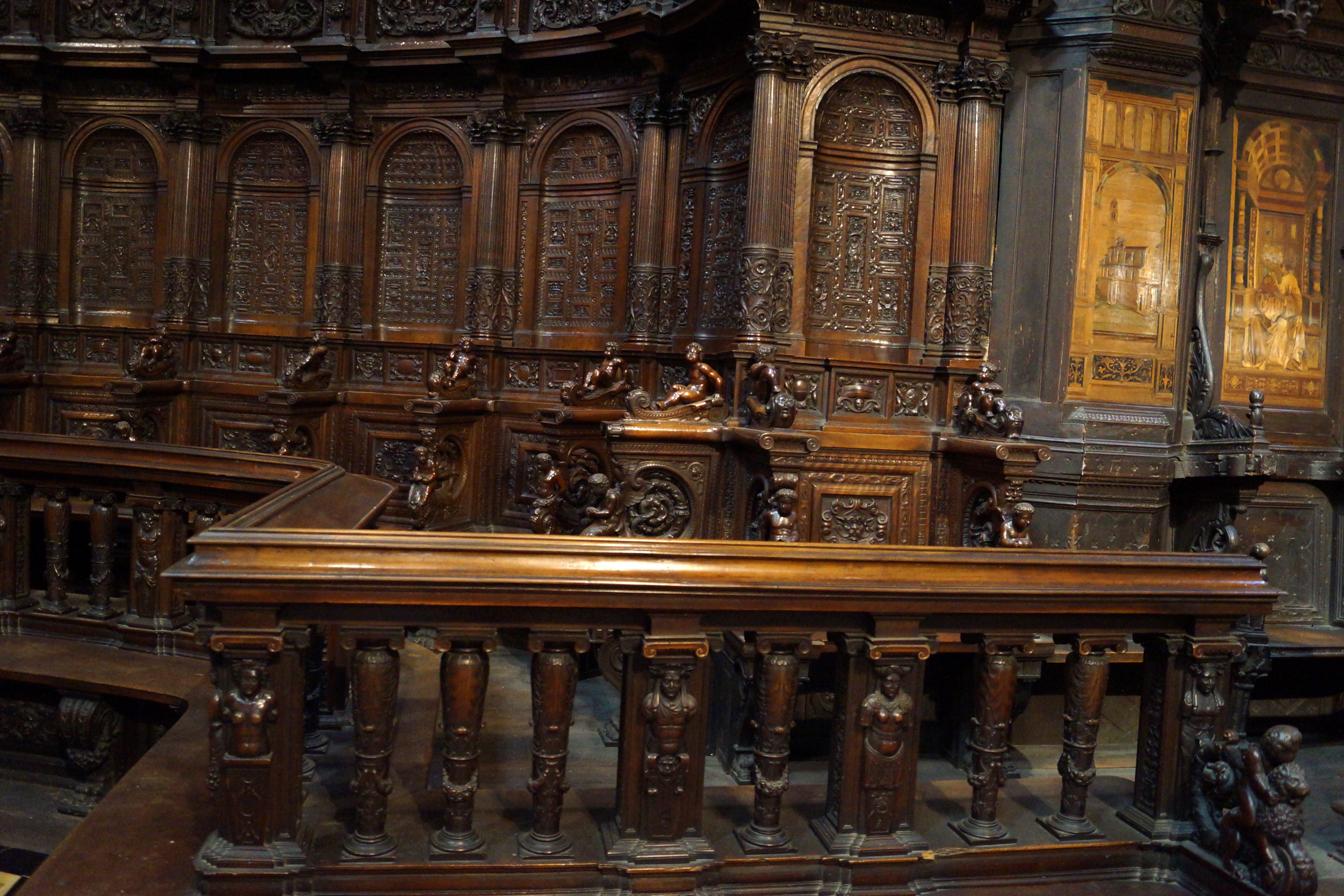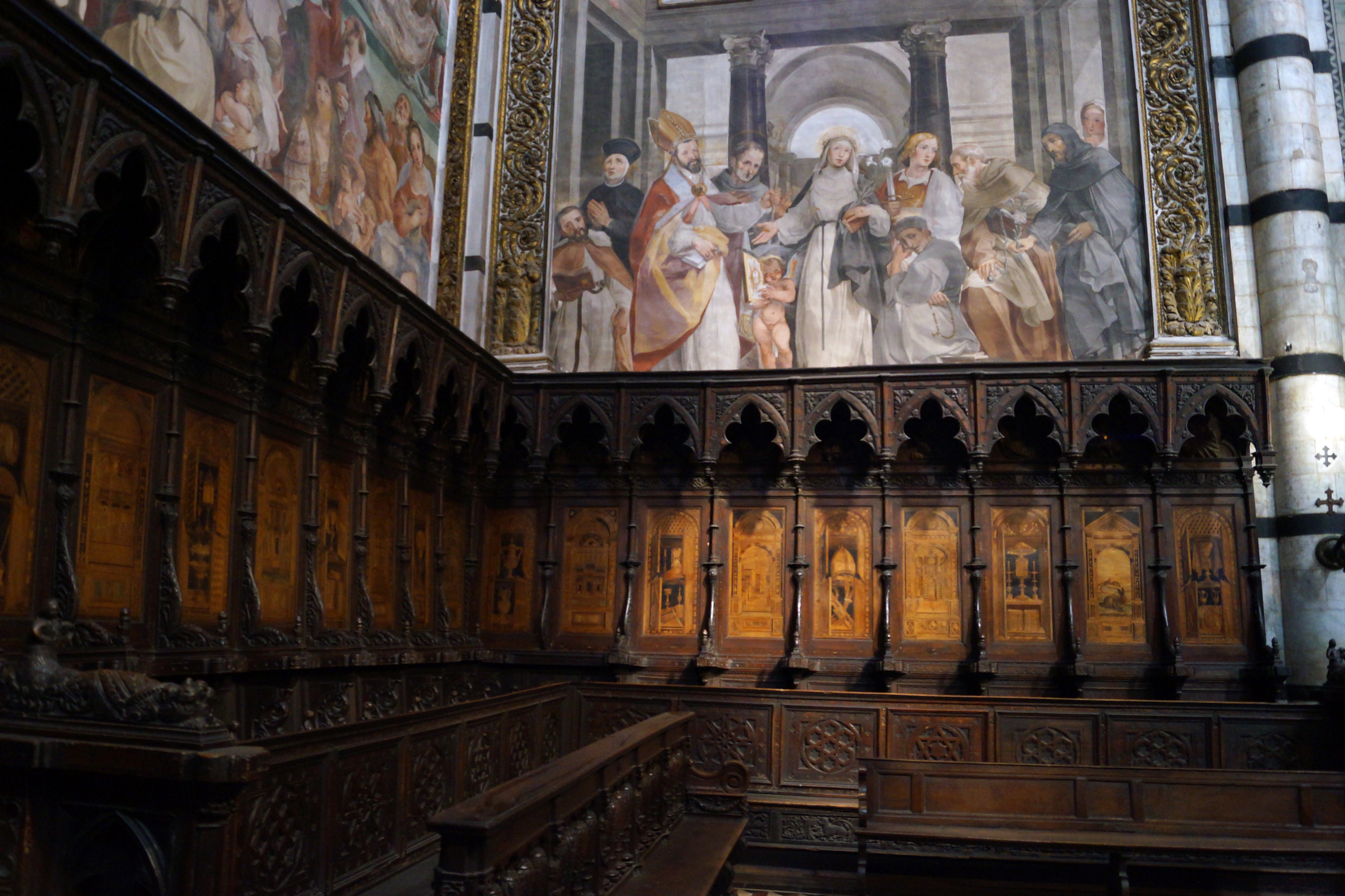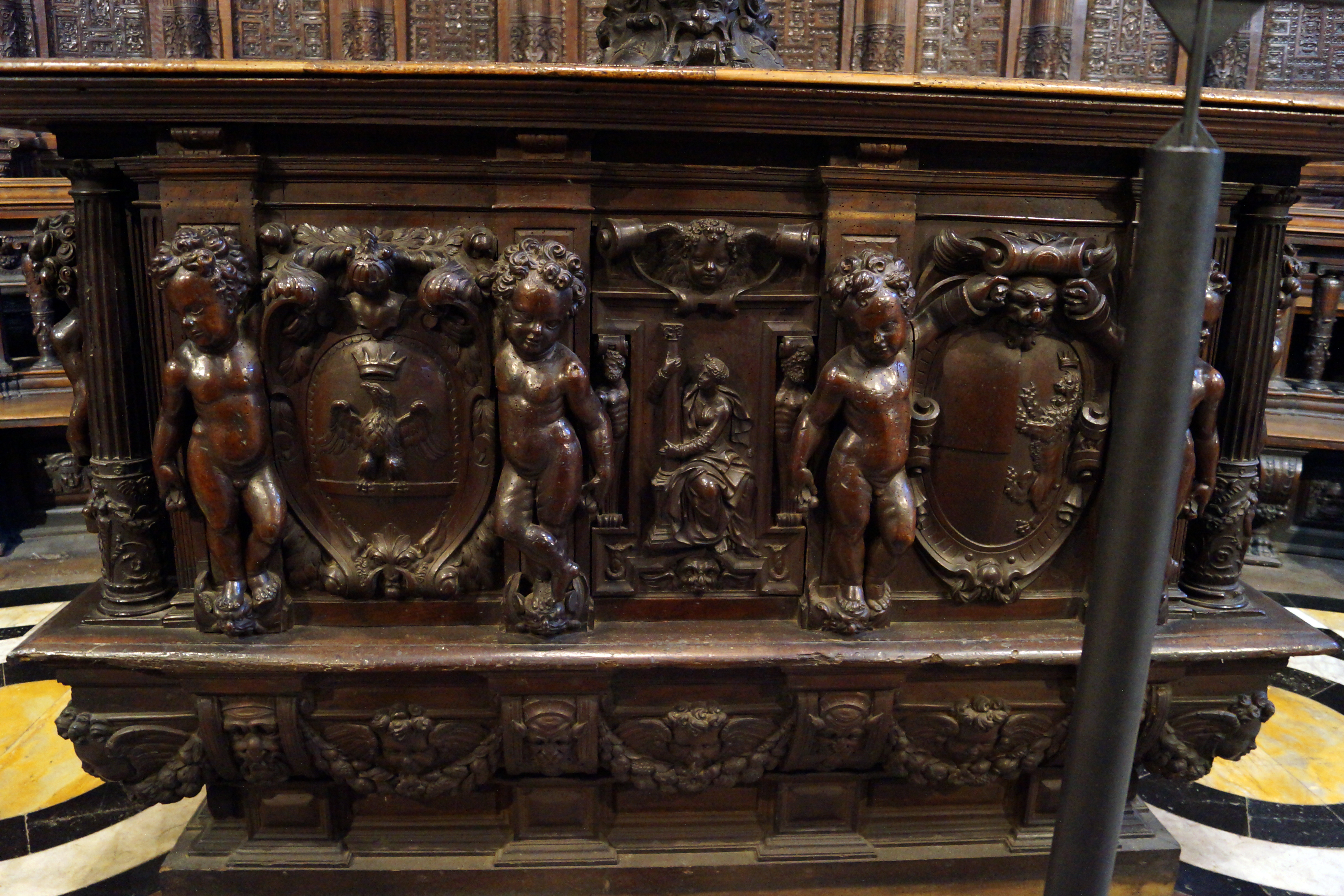Последнее вмешательство произошло в 1813 г., когда на спинки XIV в. вставили инкрустации фра Джованни да Верона, снятые с кресел из аббатства Монте Оливето Маджоре близ Сиены (начало XVI в.).