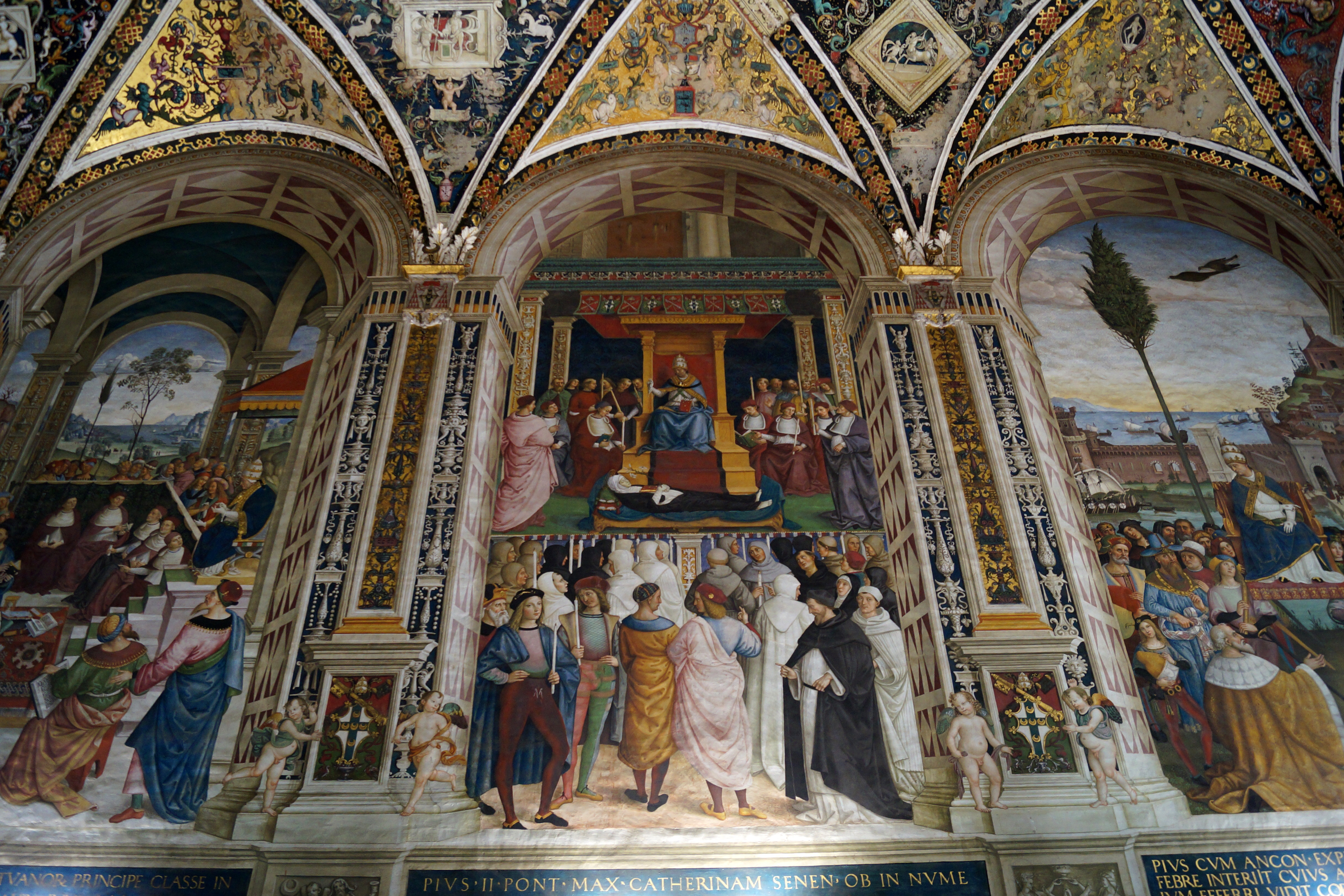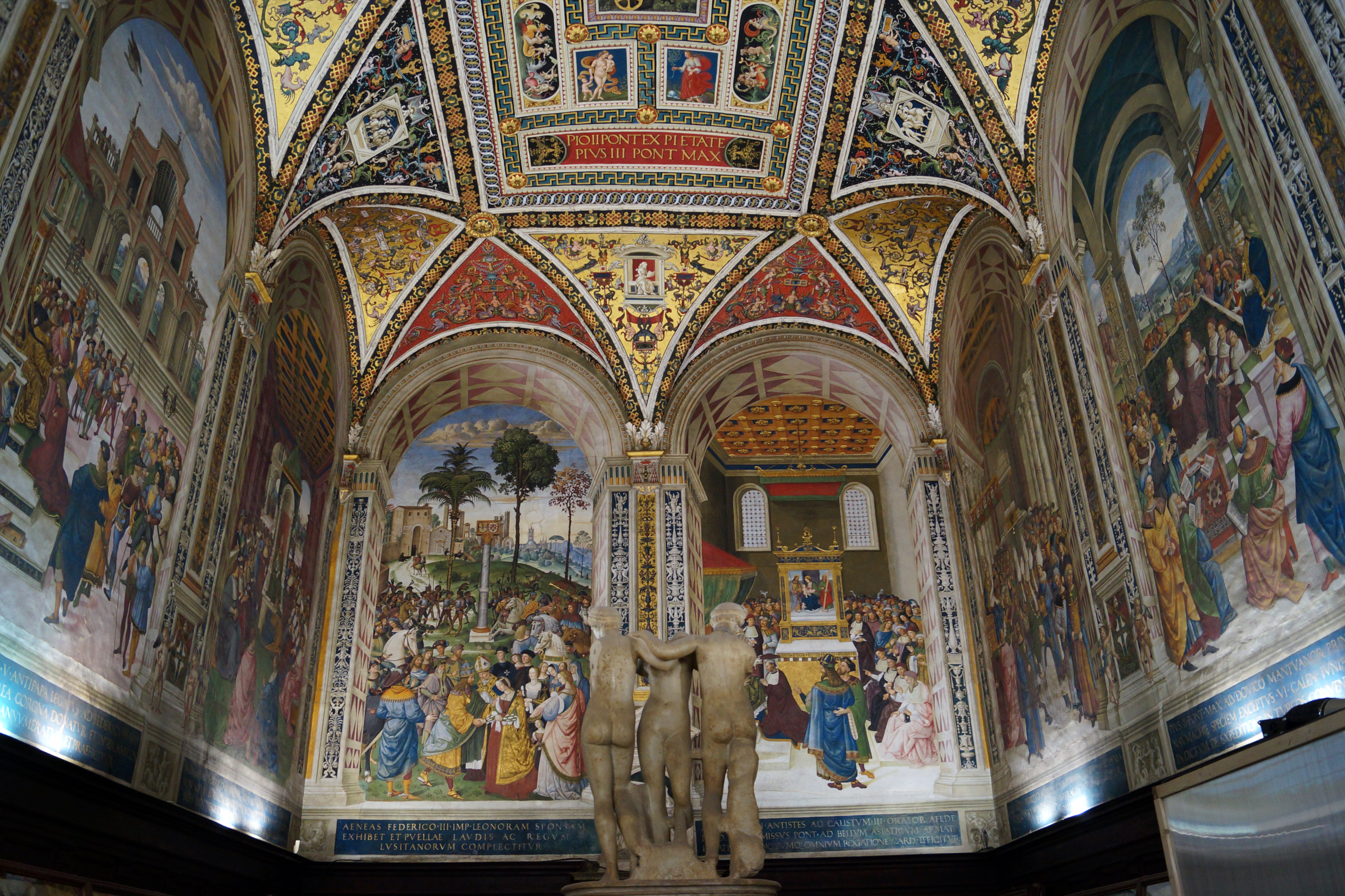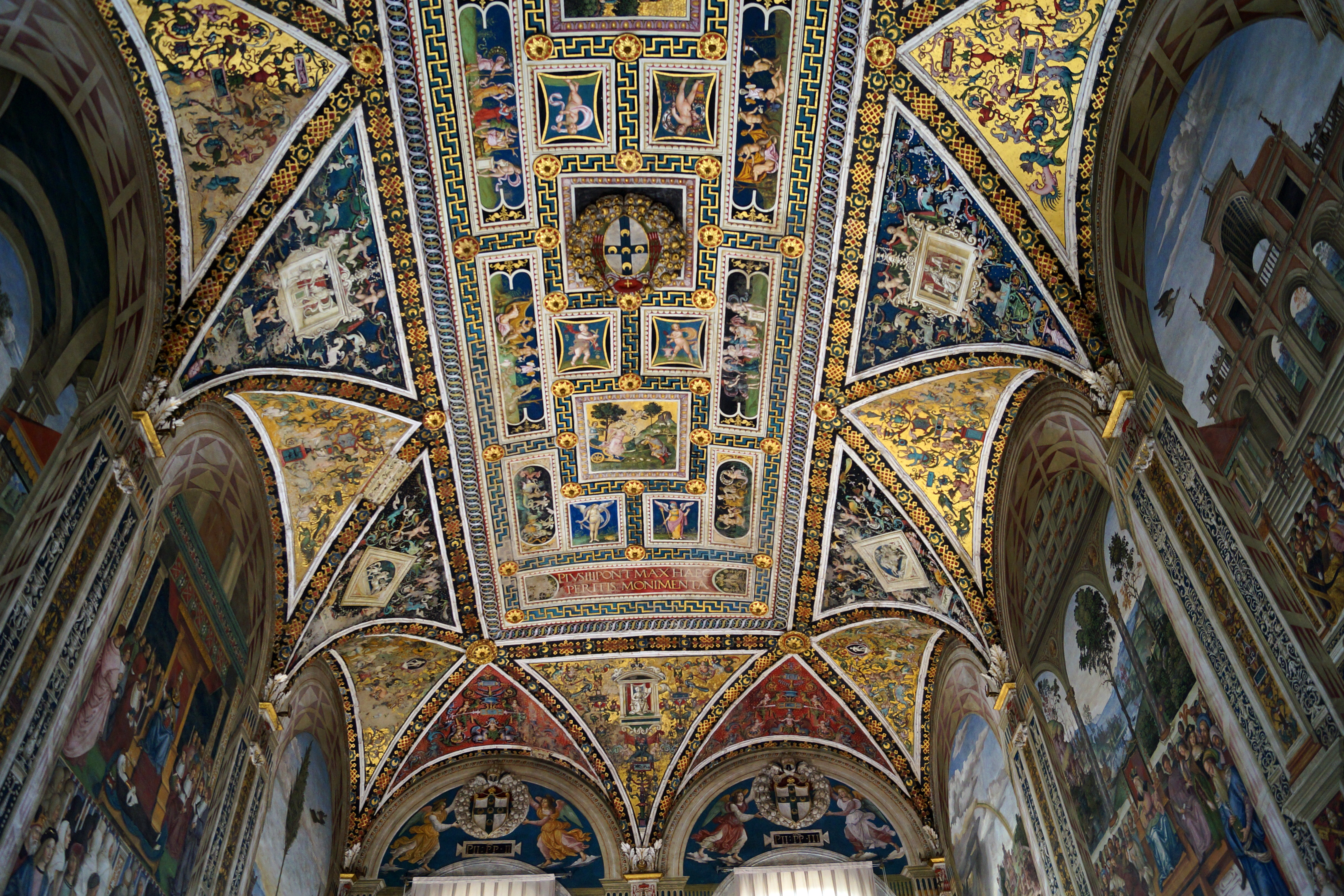 В десяти картинах художник с подмастерьями создал жиписный рассказ о жизни папы Пия II. Перед нами – фантасмагорический парад сотен персонажей, почти всегда в церемониальных одеждах, с живейшими тонами прекрасной сохранности (картины кажутся только что написанными). Плафон Библиотеки, с гербом кардинала Пикколомини в центре весь покрыт "гротесками" в стиле римского Возрождения.
