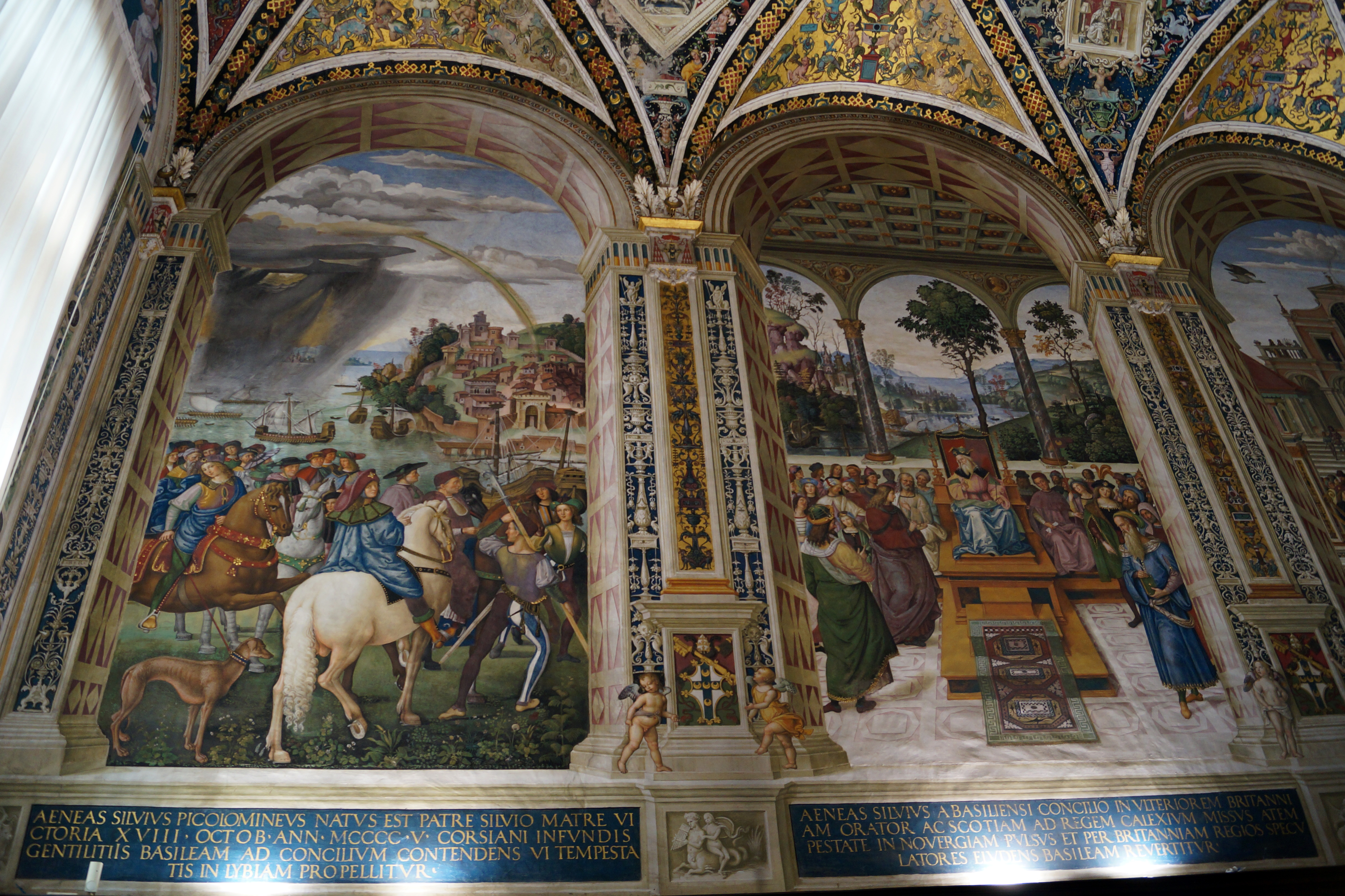 Десять сюжетов на стенах, начинающиеся с правого края от окна, могут быть определены так: Отъезд 27-летнего Энеа-Сильвио Пикколомини в Базель; Чтение Энеа-Сильвио в присутствии шотландского короля Джеймса I; Фридрих III чествует Энеа-Сильвио Пикколомини как поэта; Подчинение Энеа-Сильвио папе Евгению IV; Встреча Энеа-Сильвио, сиенского епископа, с обрученными Фридрихом III и Элеонорой Португальской в Сиене у Ворот Камоллиа; папа Каллист III избирает Энеа-Сильвио Пикколомини кардиналом; Энеа-Сильвио Пикколомини, ставший папой Пием II, вступает во владение Латеранской базиликой; Пий II созывает в Мантуе христианских государей на Крестовый поход против турок; Перед мощами Екатерины Сиенской Пий II причисляет еёк лику Святых 29 июня 1461 г. (считается, что юноша со свечой на первом плане слева – это Рафаэль, с которым, на самом деле, маэстро имеет весьма отдаленное сходство); Прибытие тяжелобольного Пия II в порт Анконы для встречи венецианскаго флота крестоносцев. В этом городе области Марке 15 августа 1464 г. папа-сиенец и скончался после нескольких месяцев напрасного ожидания.