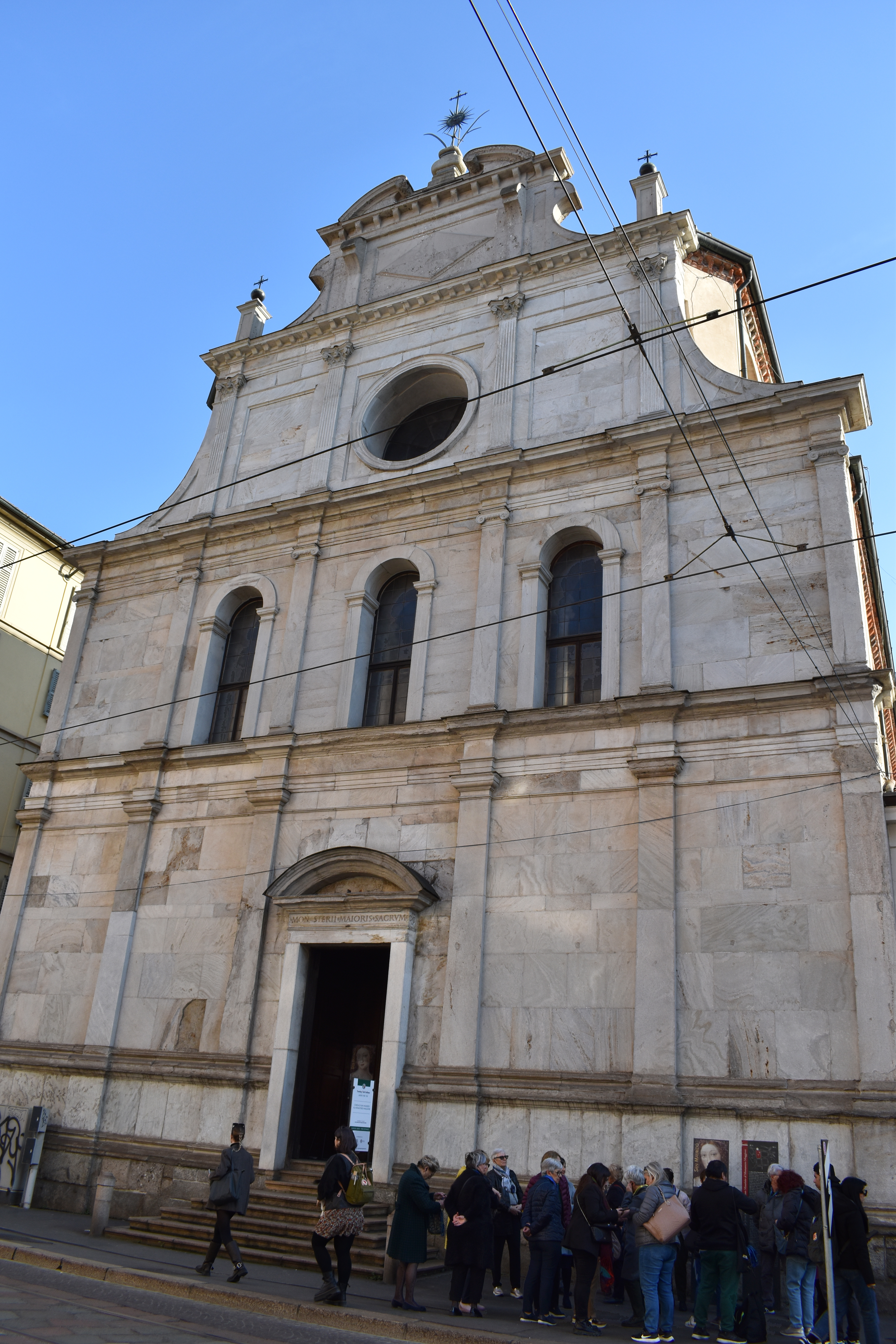 При входе в церковь Сан-Маурицио трудно не зажмуриться: в здании нет ни одного квадратного сантиметра, который не был бы украшен фресками, за исключением тех мест, где протекающий под церковью ручей частично нарушил стены. Помимо красоты, эти фрески рассказывают о влиятельных людях того времени и художниках-виртуозах, которые ценились в Милане XVI века. По обе стороны от двери находятся фрески из последней оригинальной живописной росписи 1573 года работы Симоне Петерцано (ученика Тициана и мастера Караваджо). Любопытен контраст сцен: на левой половине стены изображены семейные сцены: в люнете Иаков ухищрениями получает благословение Исаака, а внизу – сцена возвращения блудного сына. На второй половине, напротив, изображены довольно жестокие сцены: на люнете Моисей собирается бросить на землю скрижали Декалога, поняв, что в его отсутствие израильтяне предались идолопоклонству, а на картине ниже Иисус кнутом изгоняет из храма торговцев.