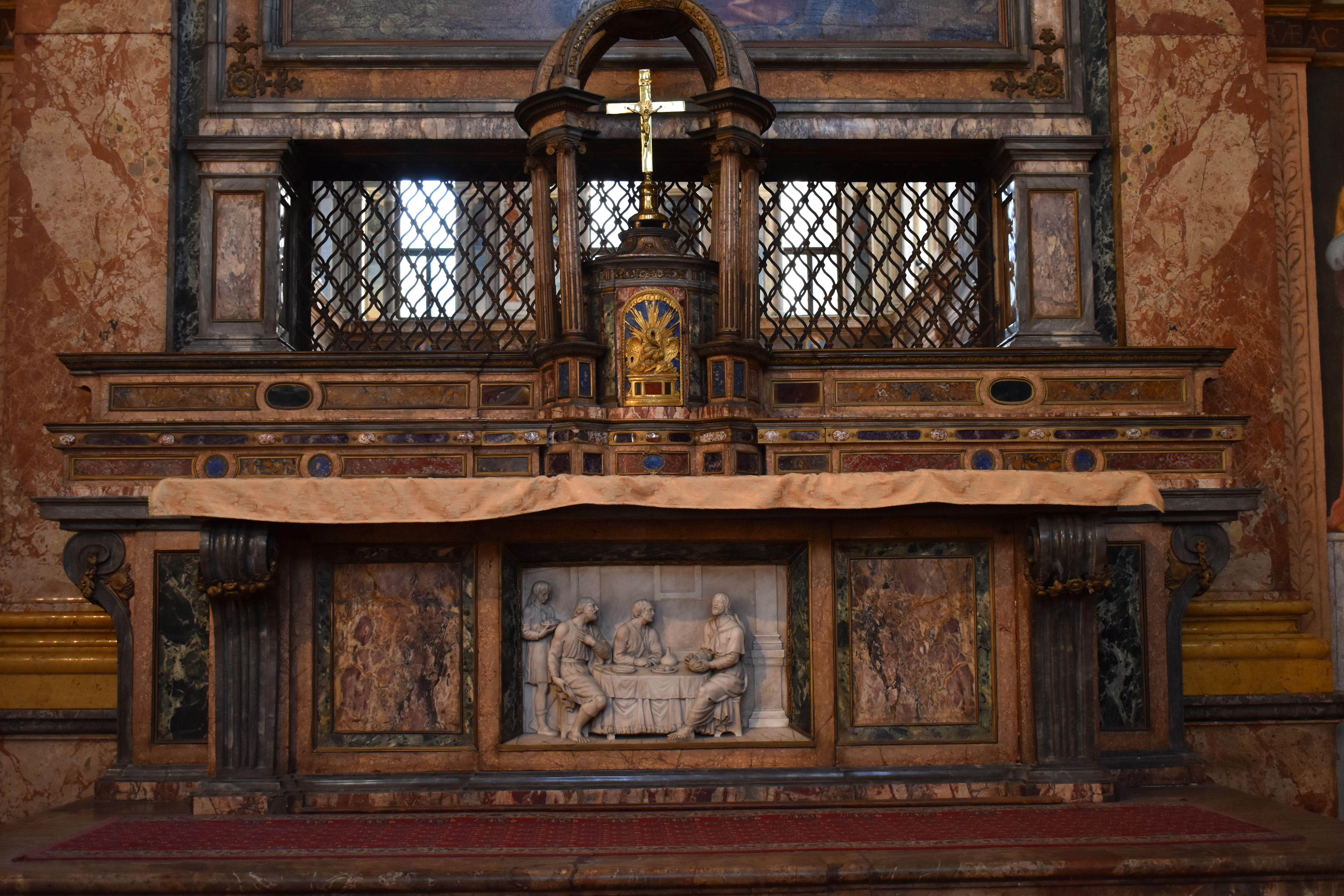 В центре стоит мраморный алтарь XVIII века, а за ним видна решётка, отделявшая зал монахинь от зала прихожан; изначально эта решётка была гораздо шире, но святой Карл (san Carlo) хотел укрепить ограждение, и в 1579 году он уменьшил её и поместил наверху полотно с Поклонением волхвов работы Антонио Кампи (Antonio Campi).
