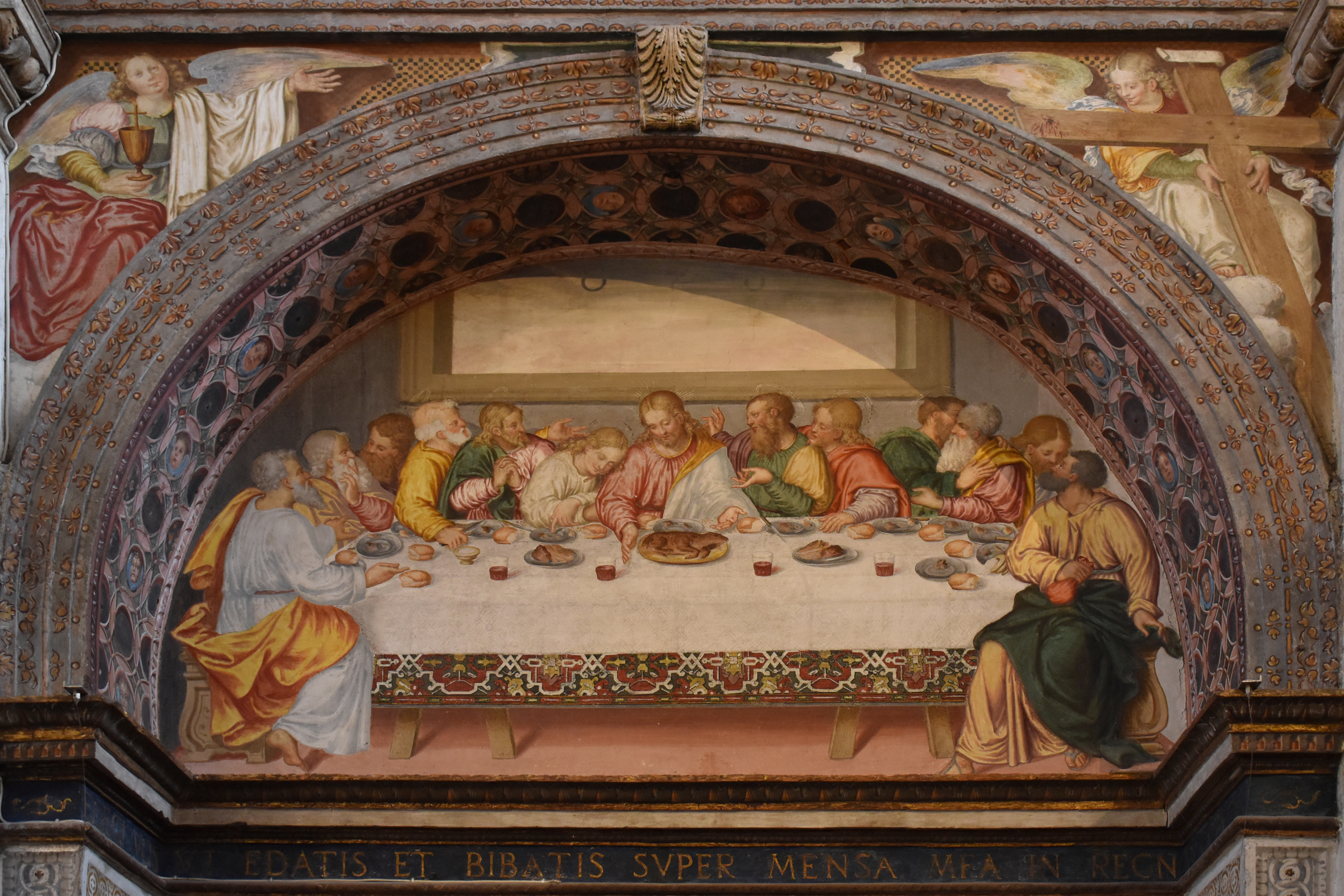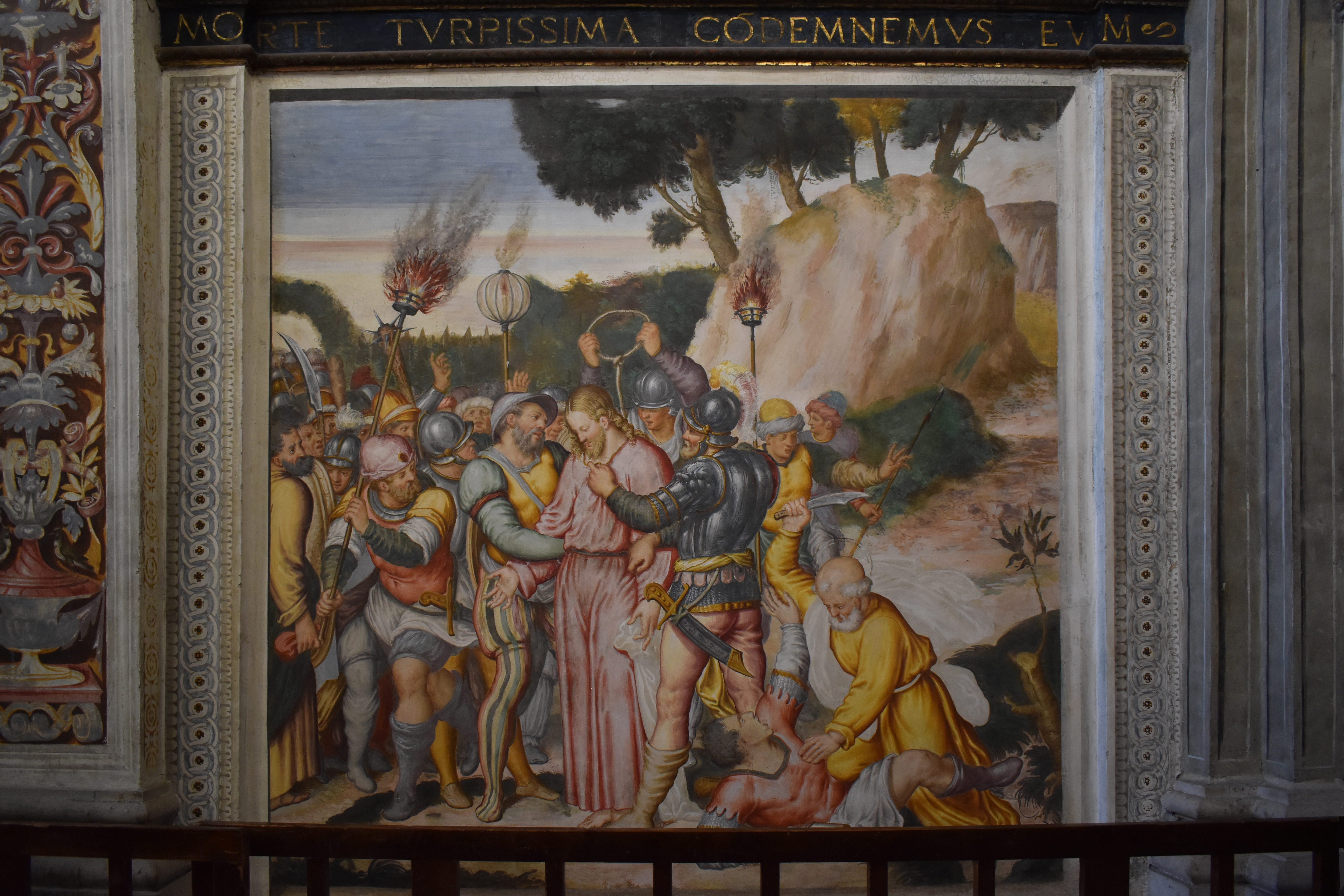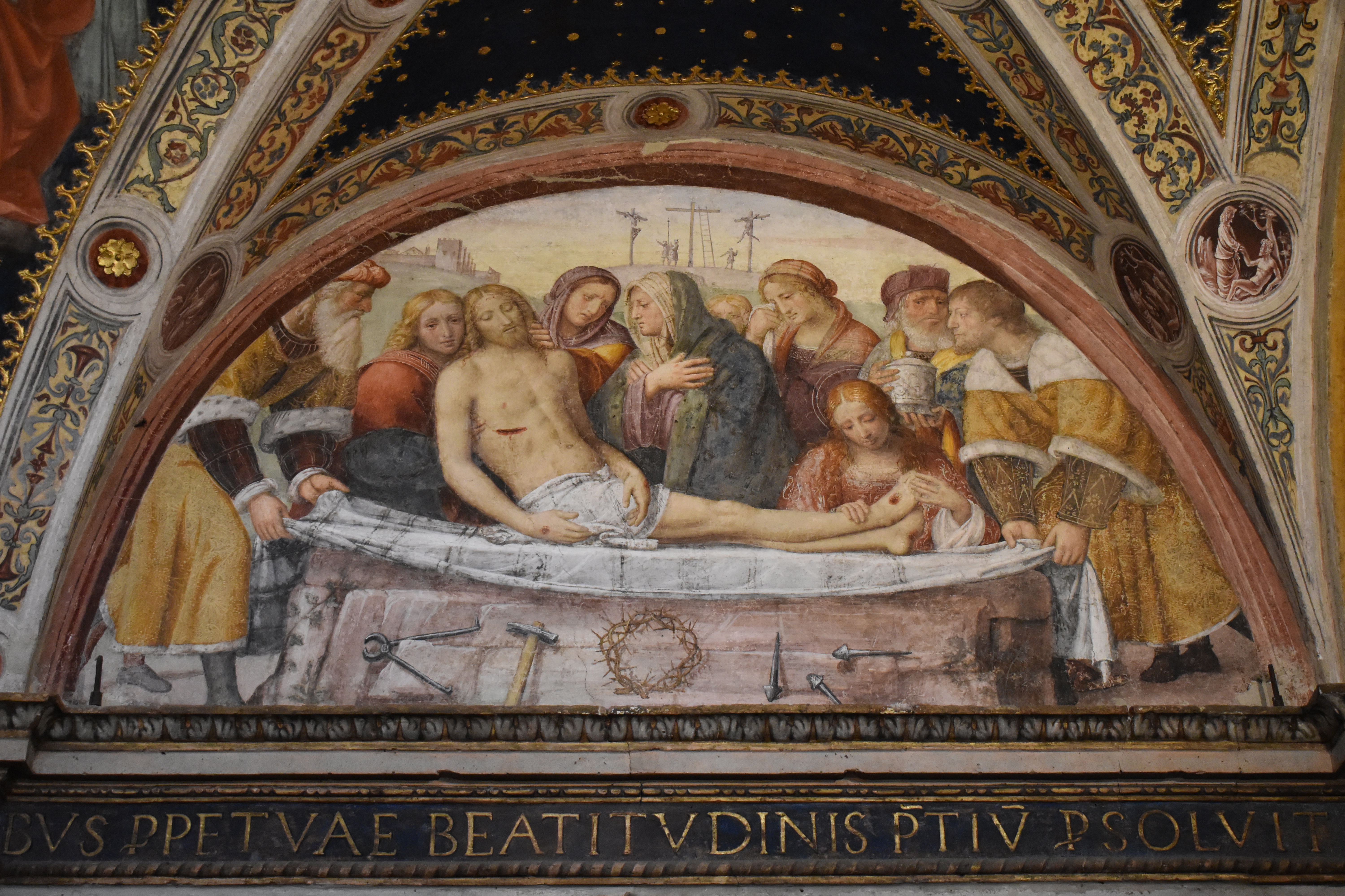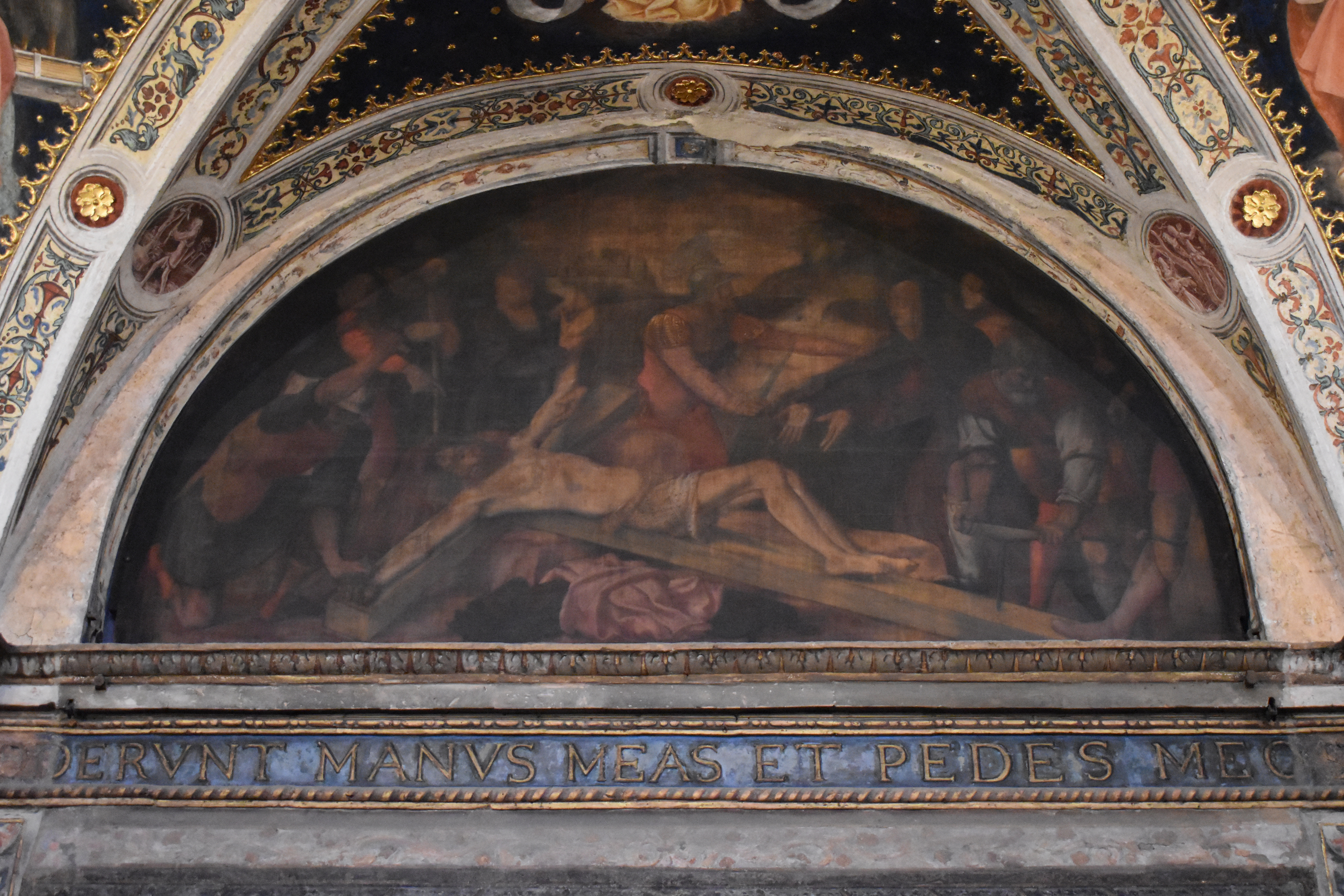 Росписи продолжилось во втором десятилетии XVI века: по заказу семьи Бентивольо Бернардино Луини написал обширный цикл, посвященный Страстям Христовым, в нижней части перегородки. Работа относится к зрелому возрасту художника и демонстрирует все его отличительные черты: теплые и яркие цвета, мягкий и тонкий рисунок, фигуры, очерченные в соответствии с идеалом классической красоты, представленные со спокойными и собранными выражениями и жестами. Представление разворачивается справа налево и начинается с эпизода "Моление Христа о чаше в Гефсиманском саду", в котором также присутствуют спящие ученики и Иуда, ведущий солдат. Она продолжается "Ecce Homo", где Пилат, одетый в роскошные царские одежды, указывает на Христа, над которым с гротескными выражениями издеваются солдаты. Далее следуют люнеты с Восхождением на Голгофу и Снятием с креста. В последней сцене в фигуре крайнего справа в драгоценных одеждах, расшитых золотом, узнается член семьи Бентивольо. В "Погребении Христа", уменьшенном в нижней части в XIX веке из-за открытия двери, вместо него присутствует монахиня, вероятно, настоятельница Алессандра. Цикл завершается слева "Воскресением" с торжествующим Христом в люнете и испуганными солдатами внизу, а также "Noli me tangere". ![]()