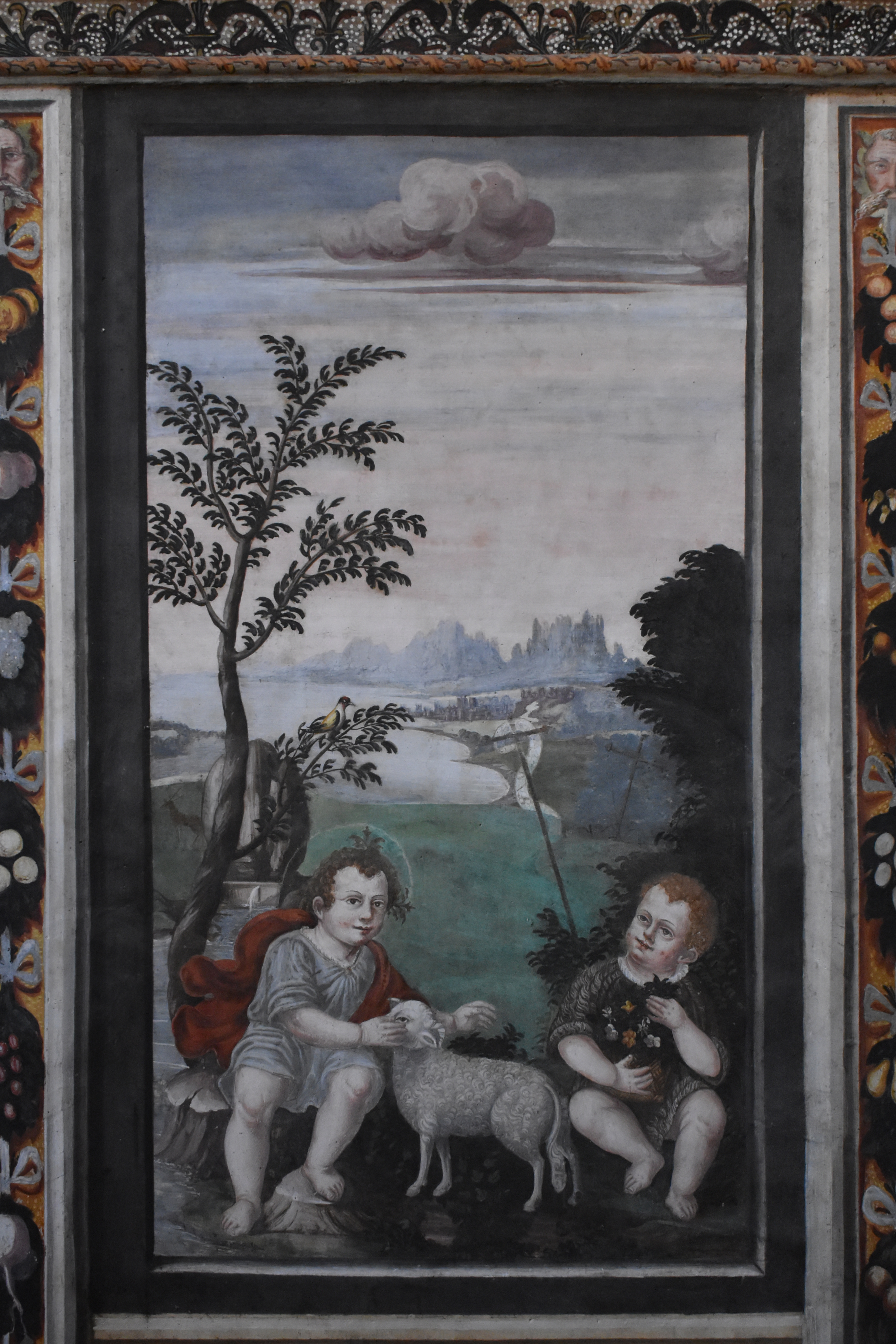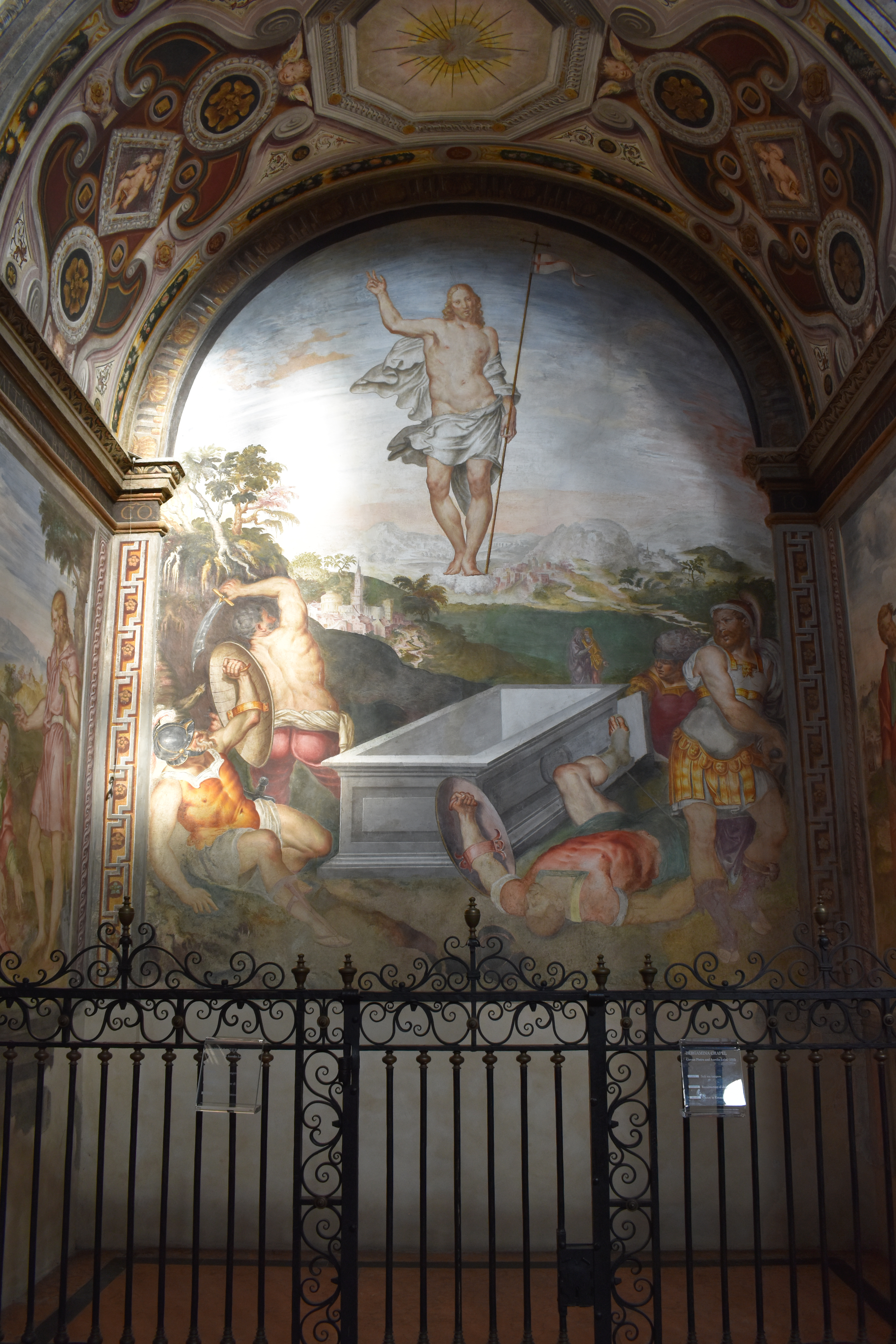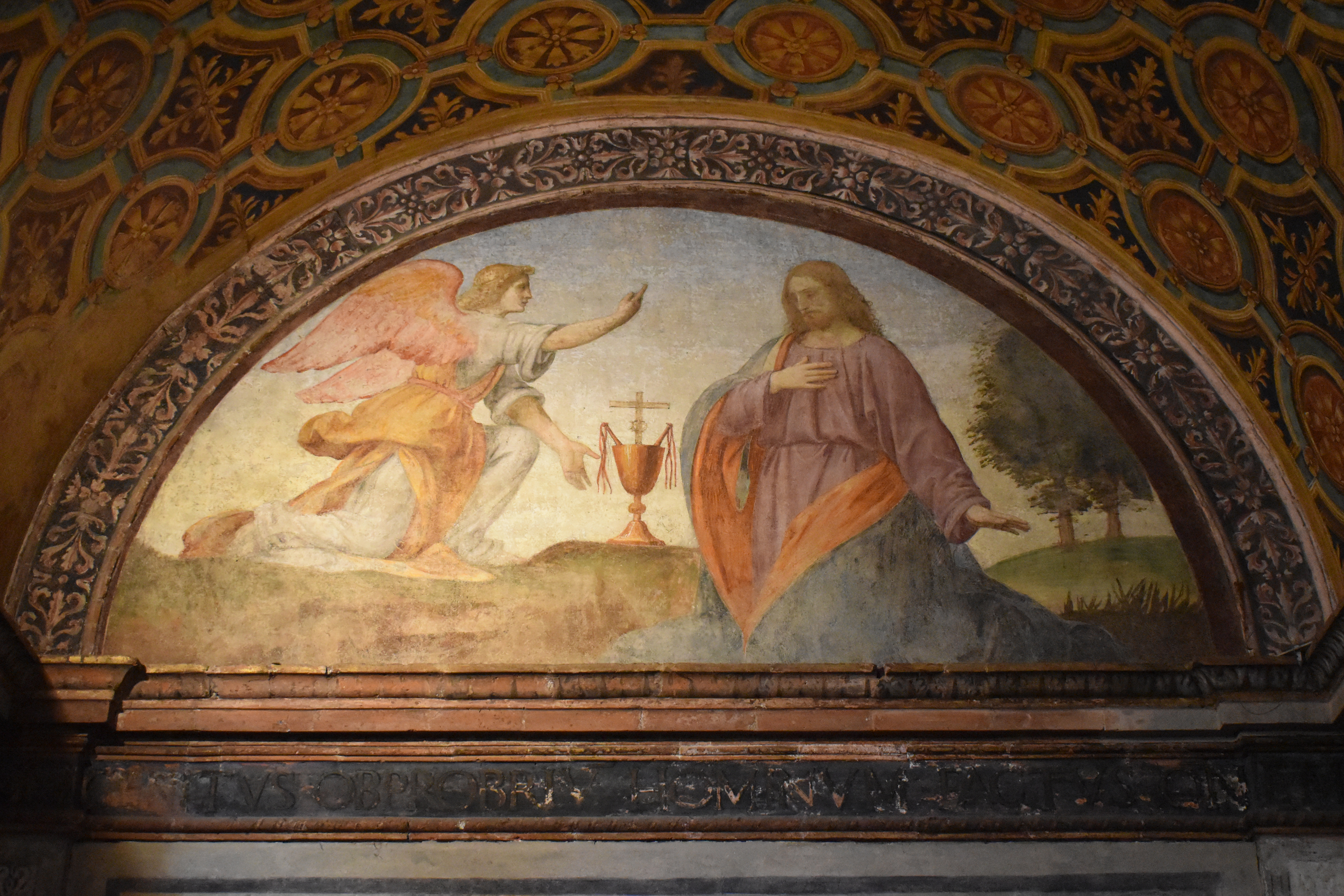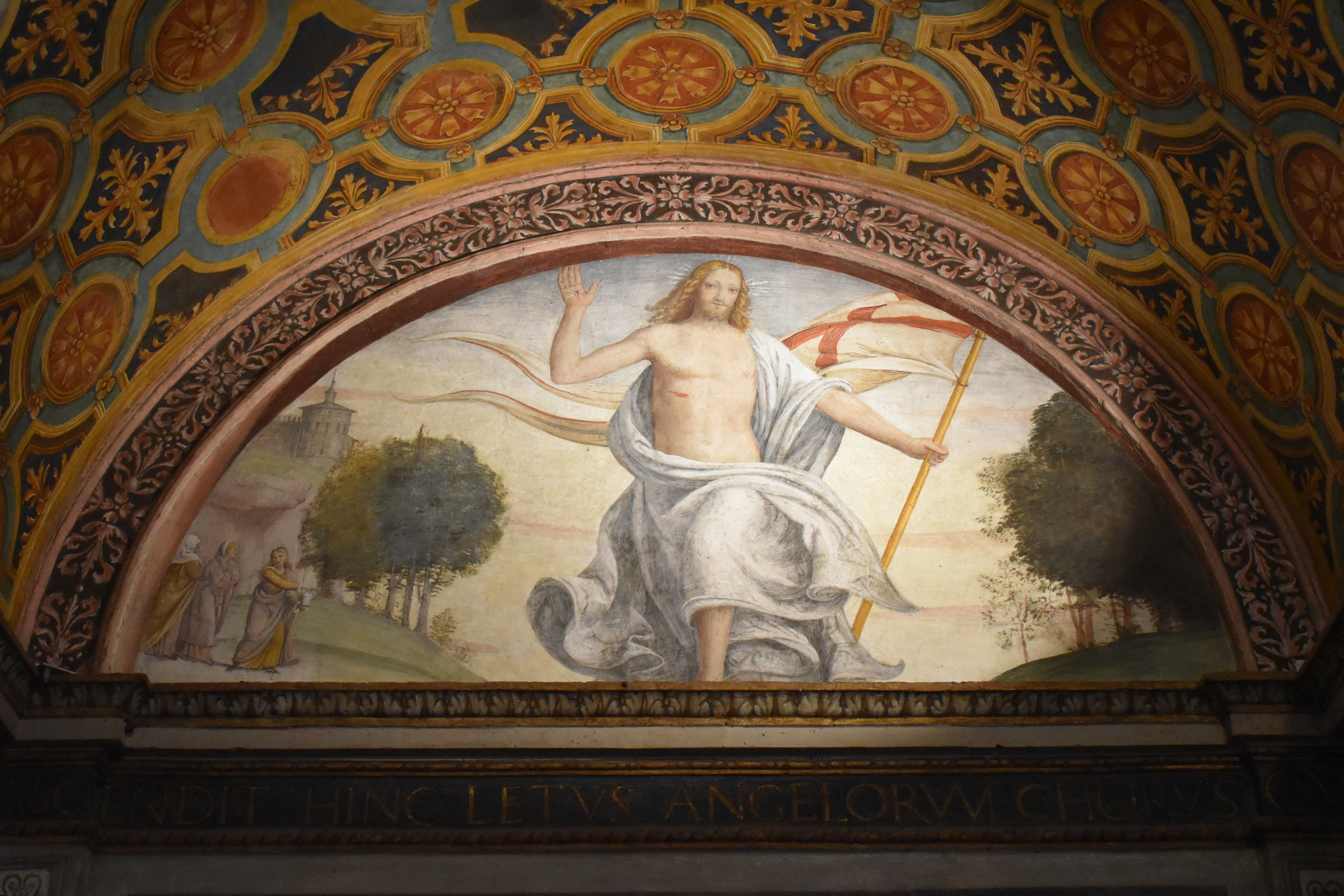 Росписи продолжилось во втором десятилетии XVI века: по заказу семьи Бентивольо Бернардино Луини написал обширный цикл, посвященный Страстям Христовым, в нижней части перегородки. Работа относится к зрелому возрасту художника и демонстрирует все его отличительные черты: теплые и яркие цвета, мягкий и тонкий рисунок, фигуры, очерченные в соответствии с идеалом классической красоты, представленные со спокойными и собранными выражениями и жестами. Представление разворачивается справа налево и начинается с эпизода "Моление Христа о чаше в Гефсиманском саду", в котором также присутствуют спящие ученики и Иуда, ведущий солдат. Она продолжается "Ecce Homo", где Пилат, одетый в роскошные царские одежды, указывает на Христа, над которым с гротескными выражениями издеваются солдаты. Далее следуют люнеты с Восхождением на Голгофу и Снятием с креста. В последней сцене в фигуре крайнего справа в драгоценных одеждах, расшитых золотом, узнается член семьи Бентивольо. В "Погребении Христа", уменьшенном в нижней части в XIX веке из-за открытия двери, вместо него присутствует монахиня, вероятно, настоятельница Алессандра. Цикл завершается слева "Воскресением" с торжествующим Христом в люнете и испуганными солдатами внизу, а также "Noli me tangere". ![]()