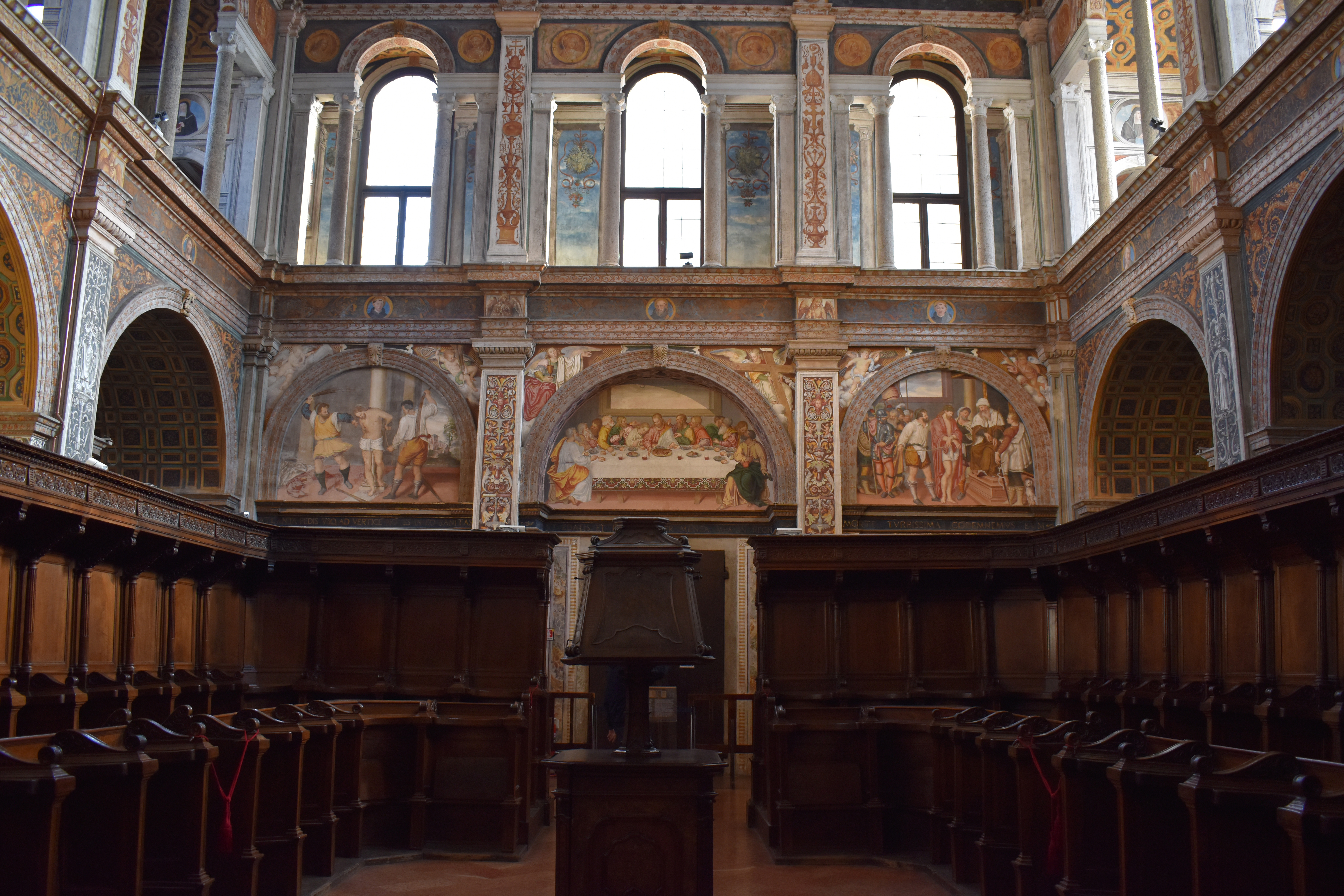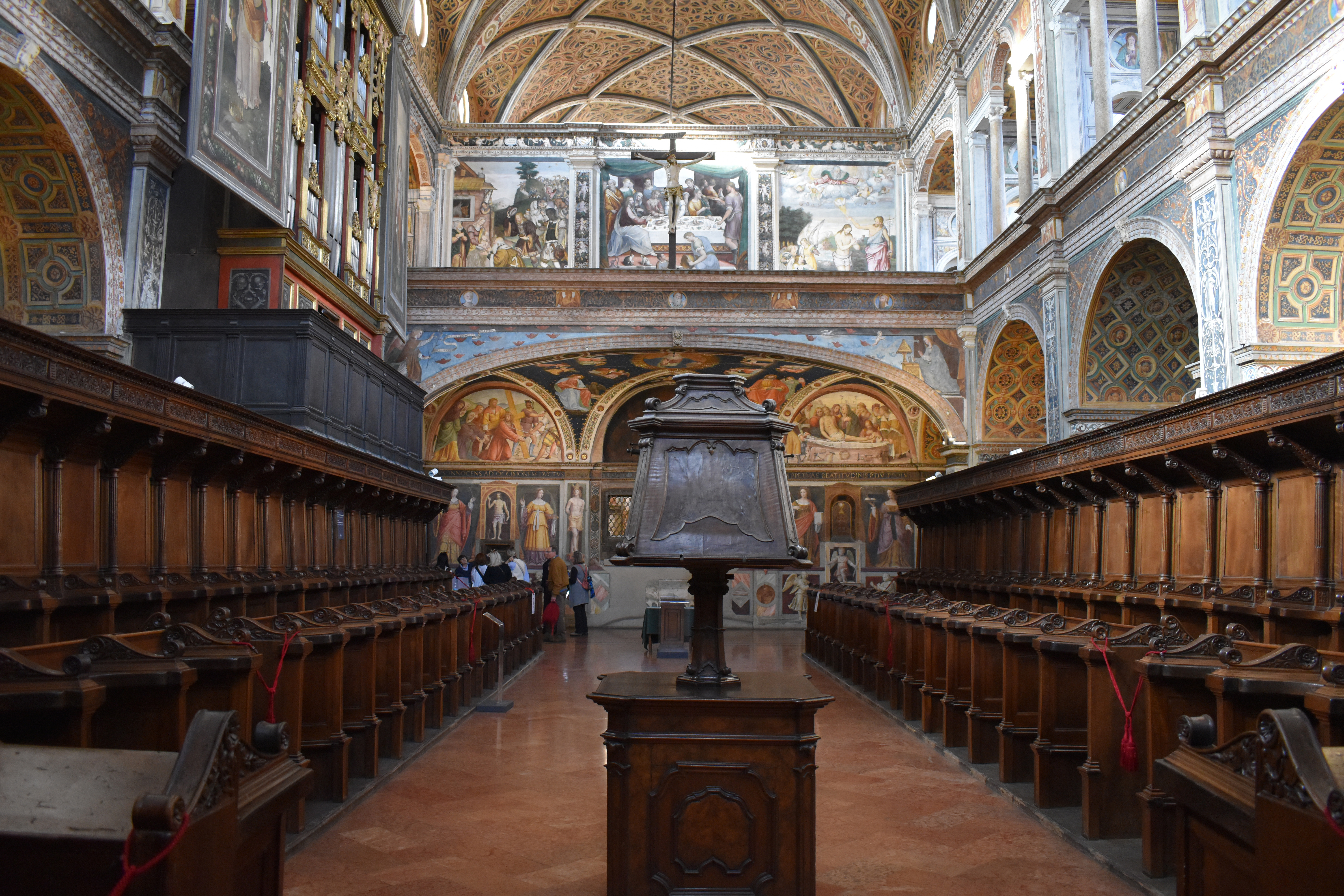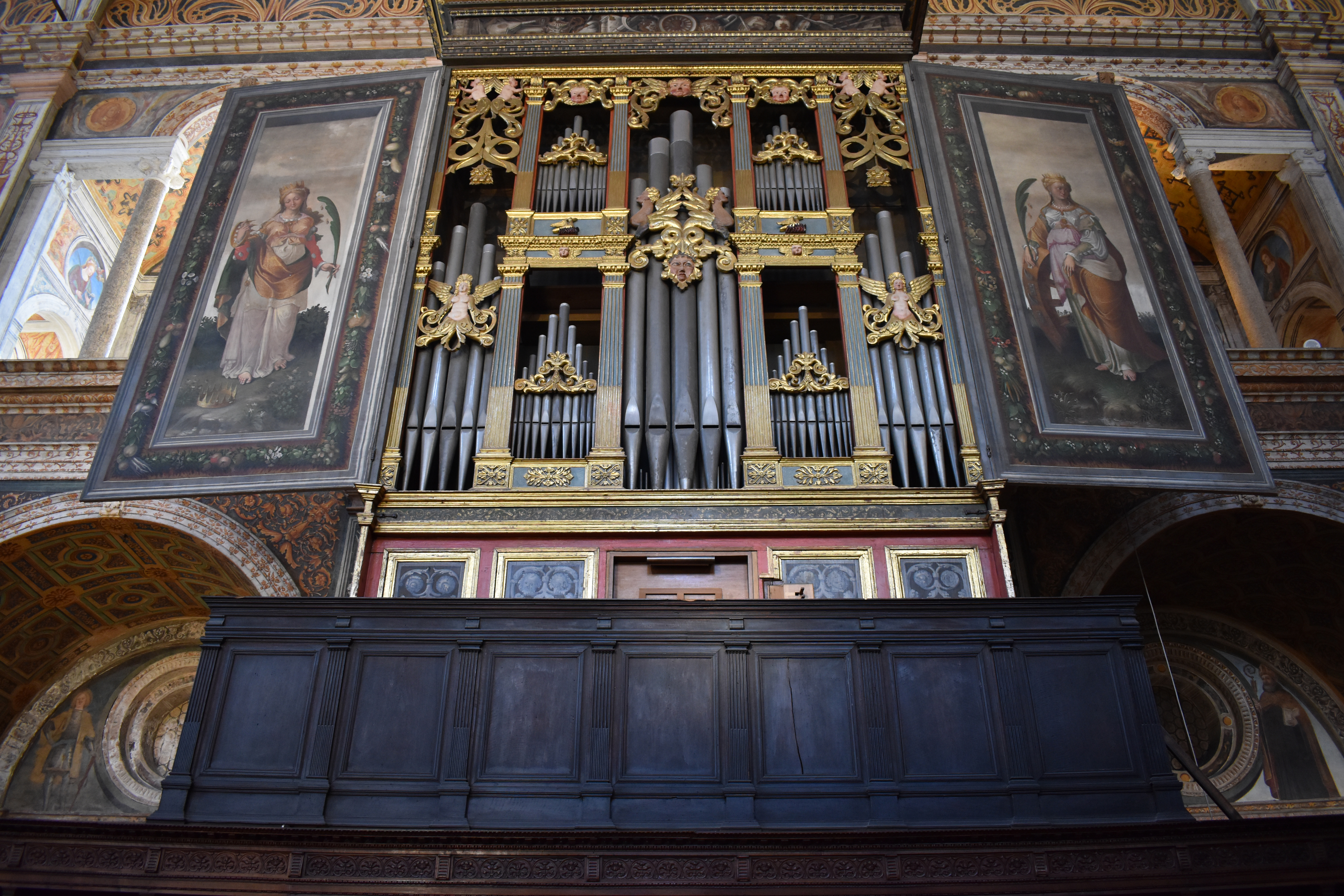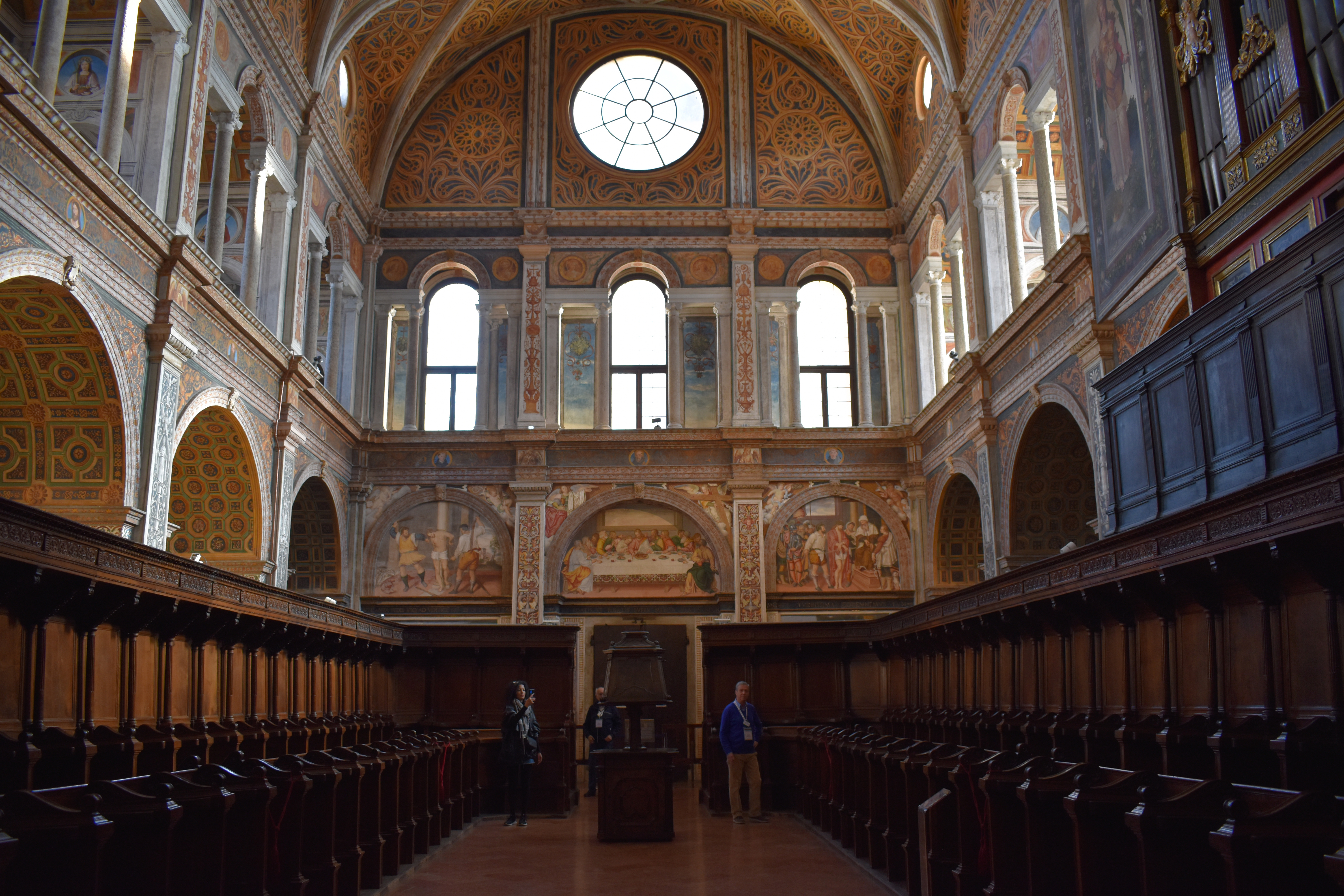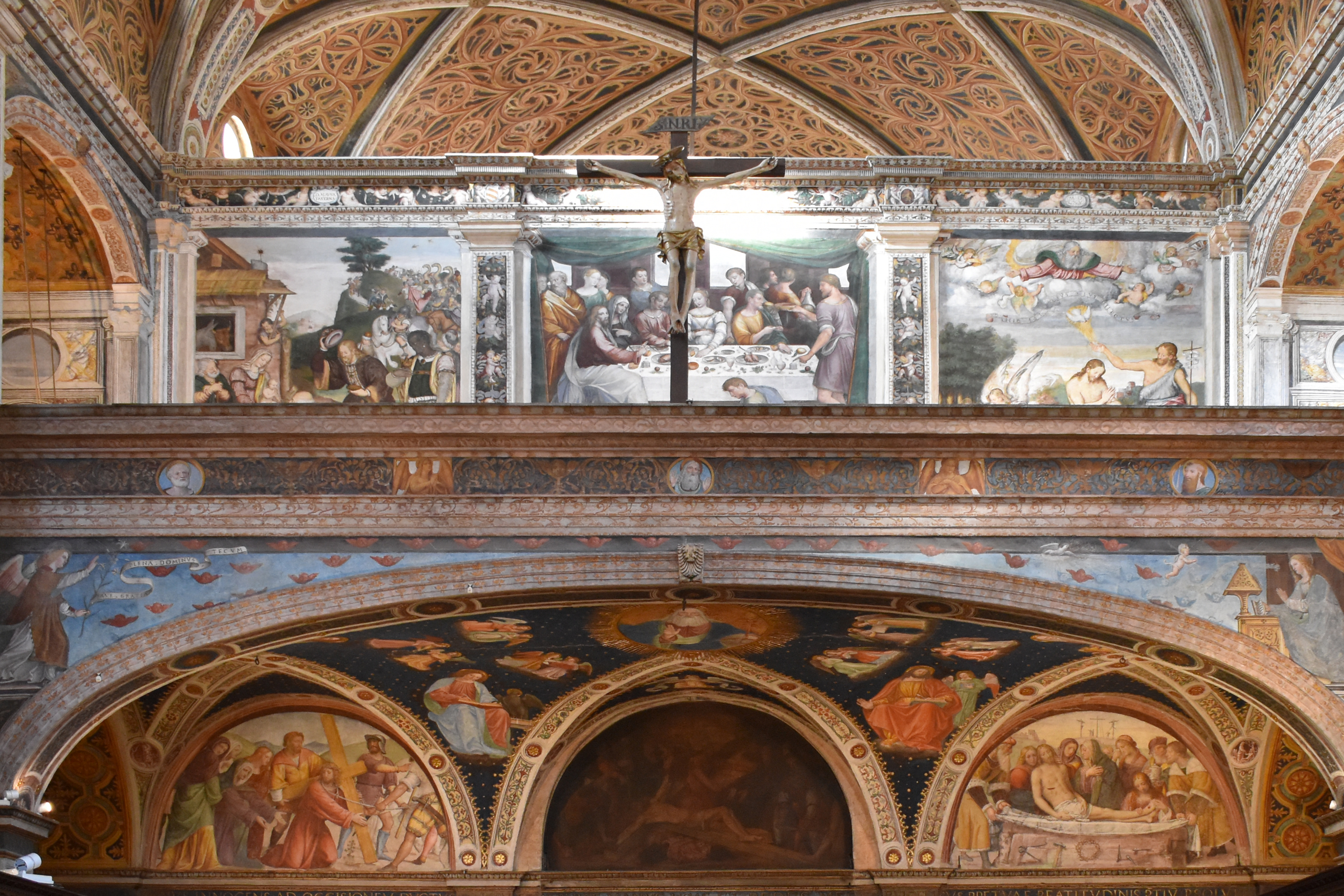 Минуя проём в капелле Бентивольо, вы попадаете в зал монахинь; сразу же бросается в глаза деревянный хор с сотней хорошо изношенными пятью веками сидений, а также большой орган Антегнати 1556 года. Ко второй половине XVI века относятся последние фрески в зале, написанные сыновьями Бернардино в тесном сотрудничестве: Джован Пьетро, Эванджелиста и Аурелио. Первым двум приписываются сцены, написанные на задней стене: Снятие с креста, Бичевание, Тайная вечеря и Поцелуй Иуды, а также две сцены, написанные на перегородке над арочным проемом. Стиль этих двух художников традиционен и спокоен. ![]()