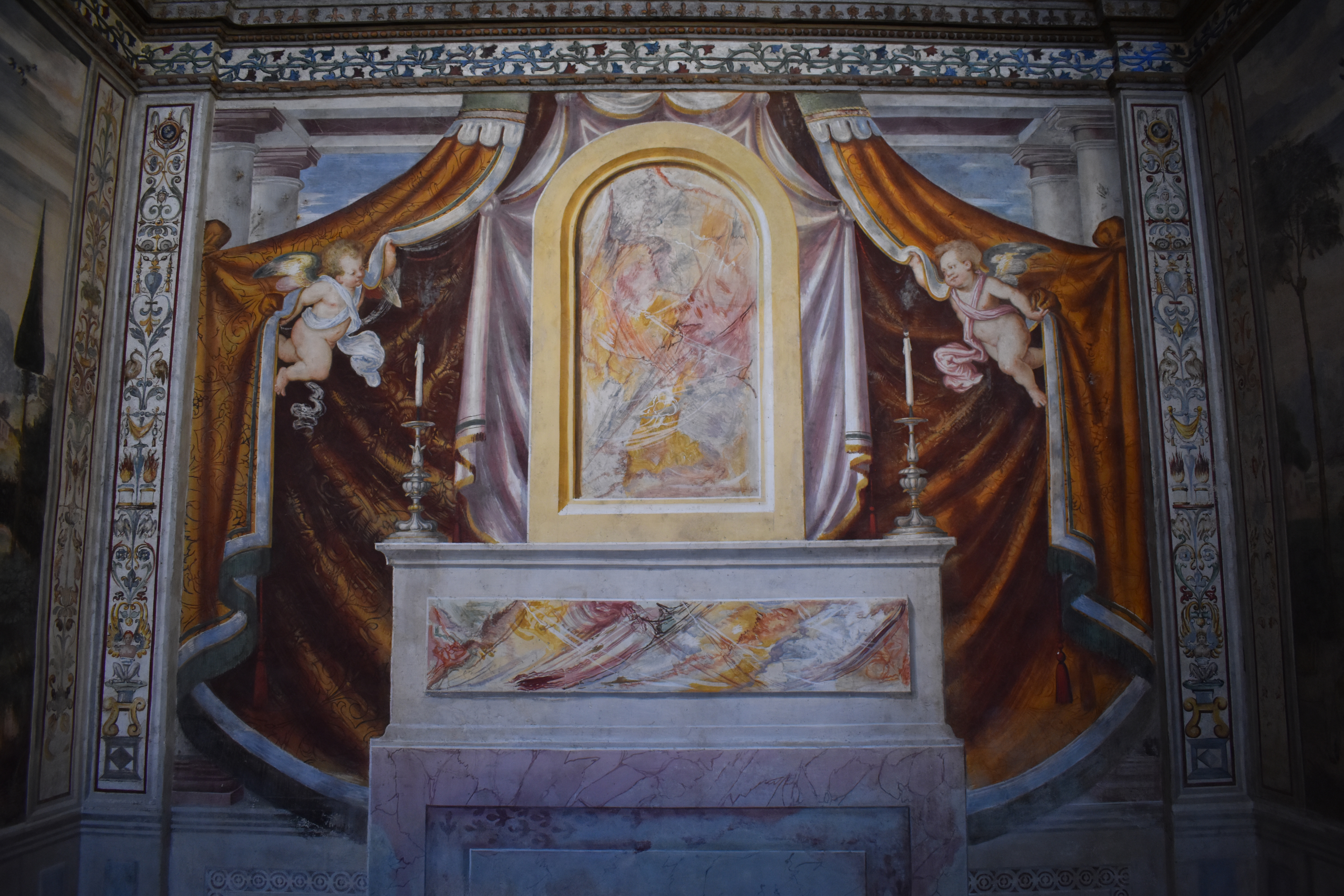 На алтарной преграде перед перегородкой находятся самые старые фрески Сан-Маурицио, изображающие Бога-Отца в окружении ангелов и евангелистов, а также Благовещение (с необычной сценой Младенца, летящего к Марии вместо голубя); росписи канделябров на пилястрах и многочисленные святые в верхней части капелл и в женских галереях датируются 1610-ми годами.