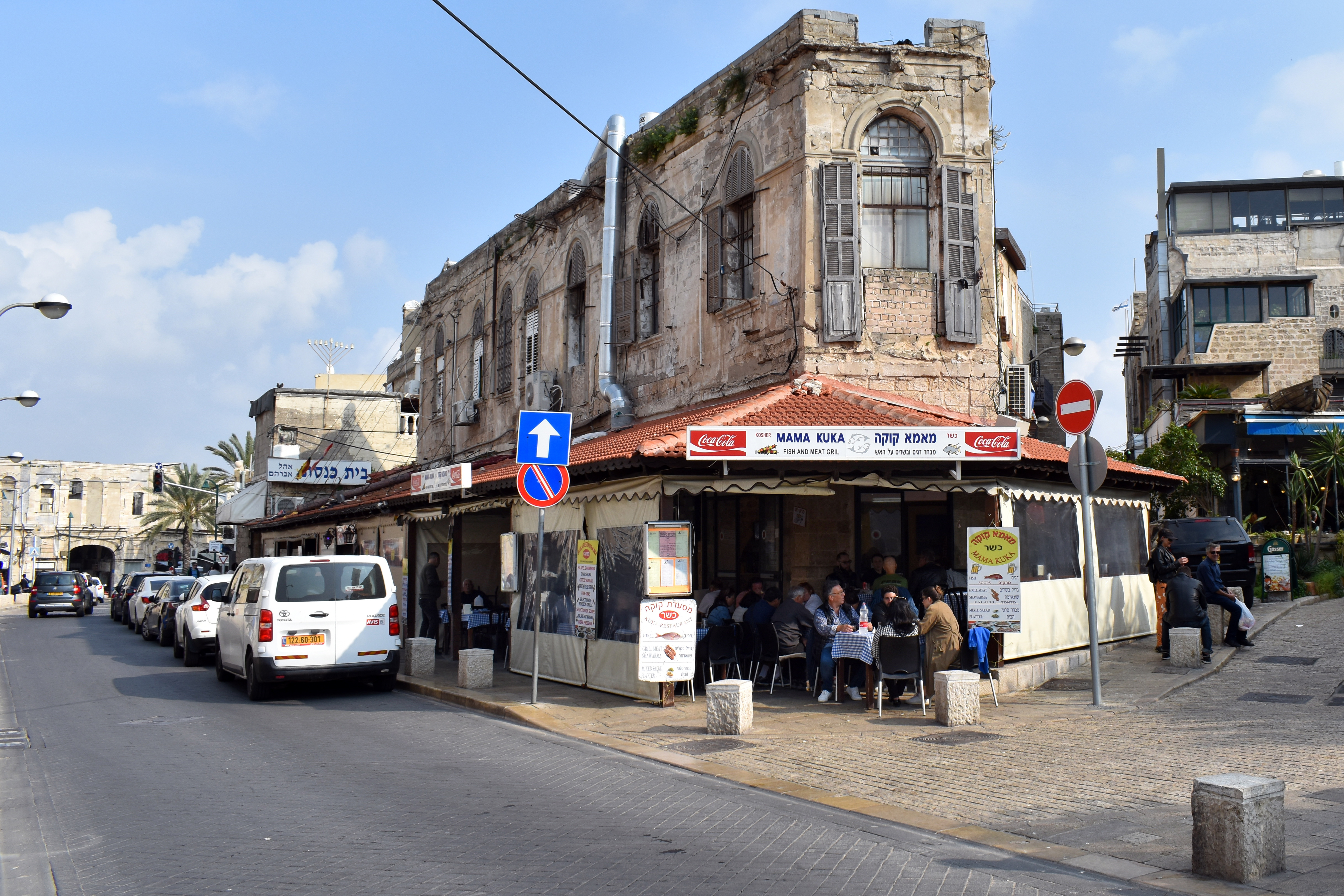 Улица Тайелет Мифраз Шломо ведёт от Старого порта к центру Яффо, где люди в полдень укрываются в тени за чашкой чая или кофе в наспех оборудованных ресторанах и кафе..