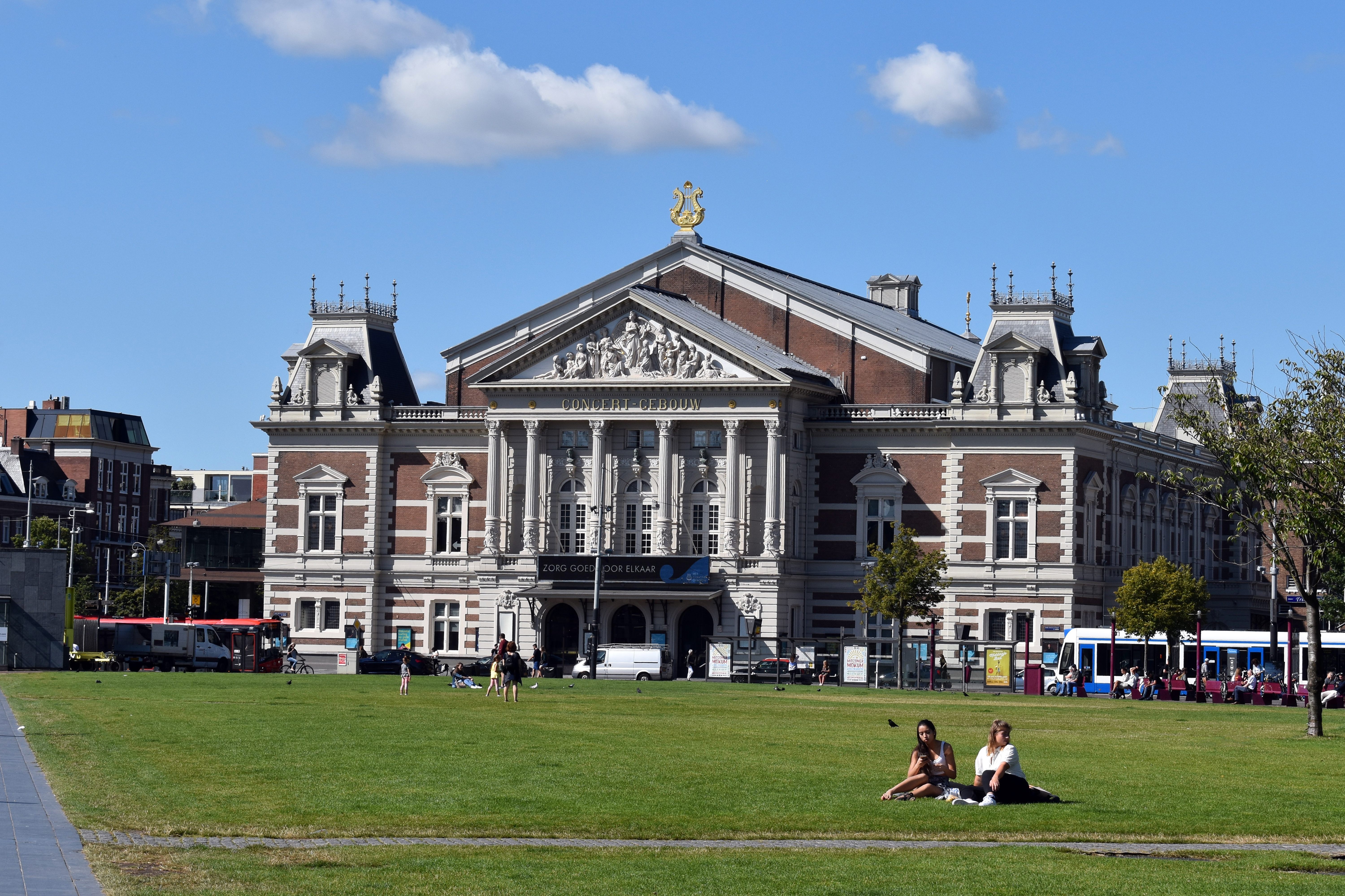 На противоположной стороне находится амстердамский концертный зал "Консе́ртгеба́у" (Concertgebouw), который знаменит своей великолепной акустикой и популярен среди ценителей музыки. Здесь ежегодно проходит около 900 концертов и выступлений разного музыкального жанра, а его два зала принимают не менее 700 000 зрителей, уступая по посещаемости лишь римскому "Парка дела Музика". В Консертгебау выступали многие прославленные музыканты не только классической, но и джазовой и даже рок-музыки. Среди них Густав Малер, Рихард Штраус, Бернард Хайтинк, Иегуди Менухин, Джесси Норман, Владимир Горовиц, Сесилия Бартоли, Луи Армстронг, Стинг и многие другие. Его домашний оркестр, Королевский оркестр Концертгебау, признан лучшим в мире, и сейчас находится на пике своей славы. Строительство Консертгебау было начато в 1881 г. на заболоченном бывшем пастбище по проекту известного голландского архитектора Адольфа Леонардо ван Гендта. Двухэтажное здание Консертгебау в стиле голландского неоренессанса украшено портиком из 6 колонн, а конек крыши венчает позолоченная лира. Внутреннее убранство, решено в белых и красных тонах с золотыми виньетками, что придает ему торжественный и праздничный вид. Большой зал вмещает около 2000 зрителей, некоторые места располагаются за сценой рядом с органом. Малый зал, предназначенный для камерных выступлений, рассчитан на 470 человек.Тайна необыкновенных акустических свойств главного зала не раскрыта и по сей день, и приписывается не иначе как помощи мистических сил.