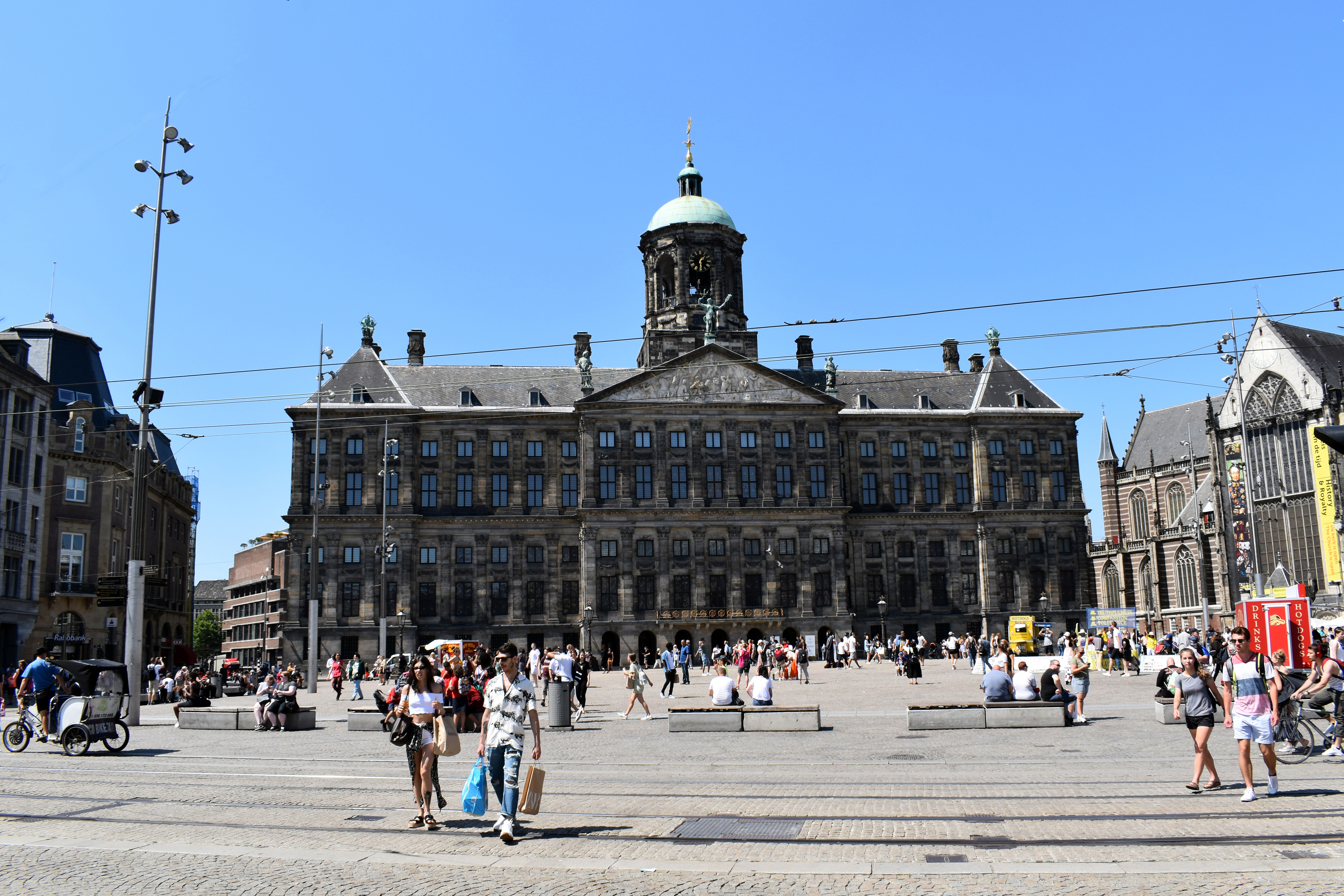 В западной части площади расположен Королевский дворец, выполненный в неоклассическом стиле. Дворец был построен в XVII веке. Возведение этого архитектурного произведения искусства, как часто с ними случалось в те времена, шло довольно вяло: начиная с 1648 и вплоть до 1665 гг. Но как только изумленным горожанам дом на площади Дам предстал во всей красе, наиболее восторженные из них окрестили его "восьмым чудом света". Прозвище дворец получил не напрасно, ведь его автором был знаменитый голландский архитектор Якоб ван Кампен. До начала XIX столетия дворец служил городской ратушей, однако в эпоху наполеоновских войн стал резиденцией Луи Бонапарта. После этого принадлежал Оранскому королевскому дому, а в 30-е гг. прошлого века был выкуплен государством.